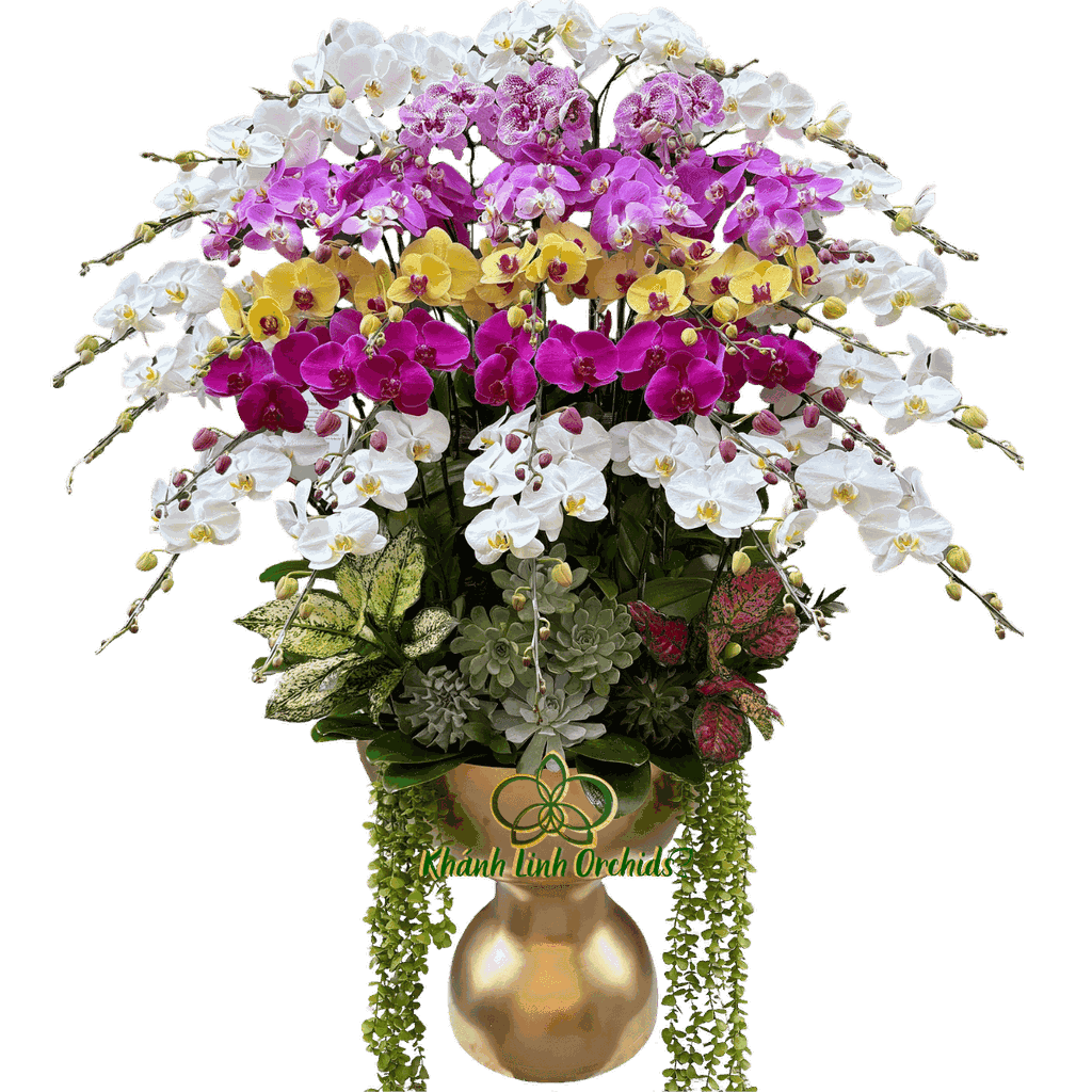 Chậu lan hồ điệp phối 5 màu 34 cành là lựa chọn lý tưởng để trưng bày trong những không gian sang trọng như đại sảnh, biệt thự, khách sạn, hay làm quà tặng trong các dịp đặc biệt như khai trương, lễ Tết, mừng thành công. Đây là biểu tượng của sự viên mãn, vững bền, thịnh vượng và hạnh phúc lan tỏa.