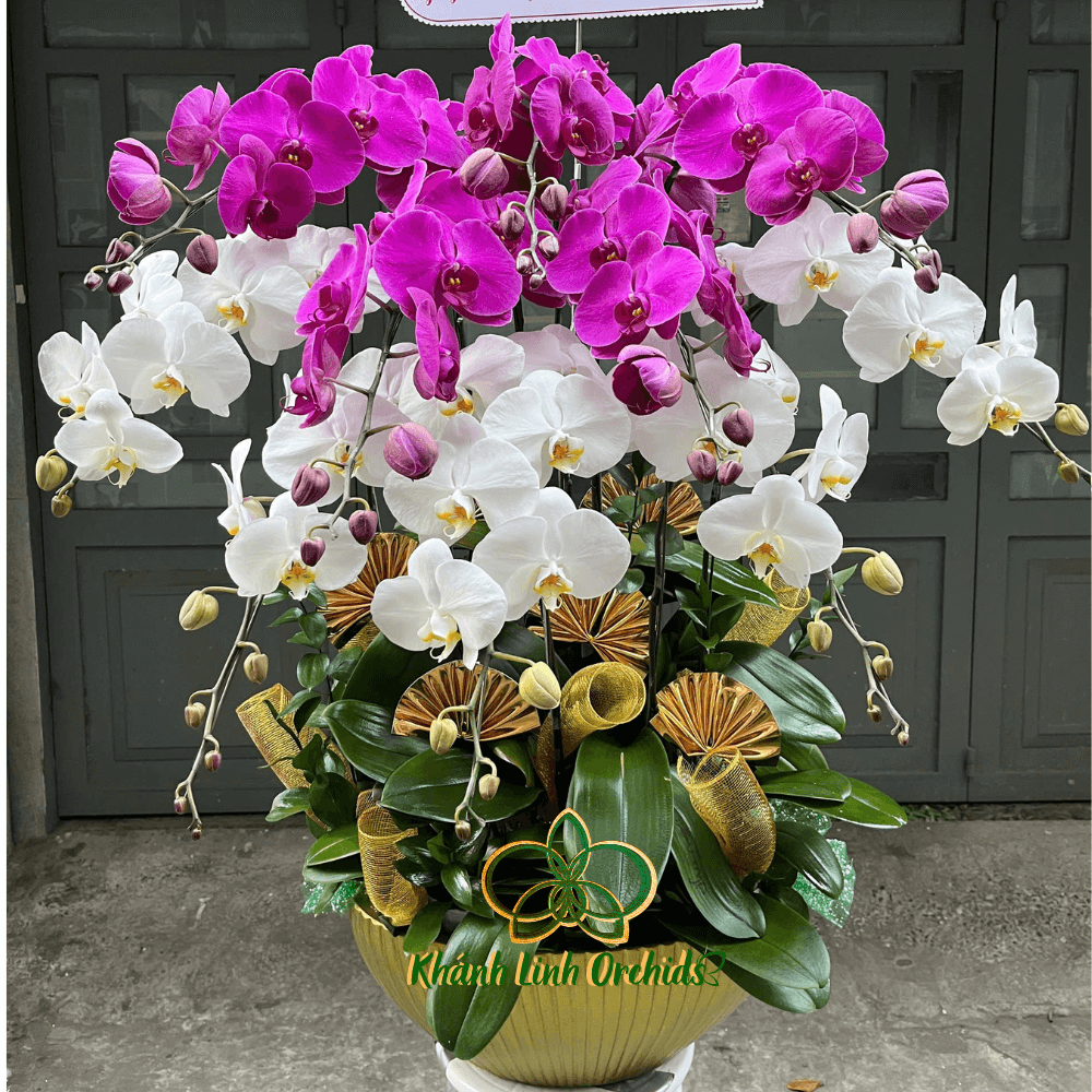 Hoa được thợ của Hoa Lan Khánh Linh cắm tinh tế trong chậu xi măng thuyền màu vàng đồng, mang lại cảm giác cổ điển nhưng không kém phần hiện đại. Điểm nhấn là chiếc quạt màu vàng được thiết kế đầy nghệ thuật, làm nổi bật thêm sự quý phái của tổng thể. Phần gốc lan được bao phủ bởi lớp lá xanh mát, tạo sự mềm mại và cân đối, đồng thời làm tôn lên vẻ đẹp rực rỡ của những cành hoa phía trên. Chậu hoa này không chỉ là vật trang trí đẳng cấp, mà còn mang ý nghĩa phong thủy tốt lành, là món quà hoàn hảo để dành tặng trong những dịp quan trọng hoặc để làm đẹp không gian sống và làm việc.