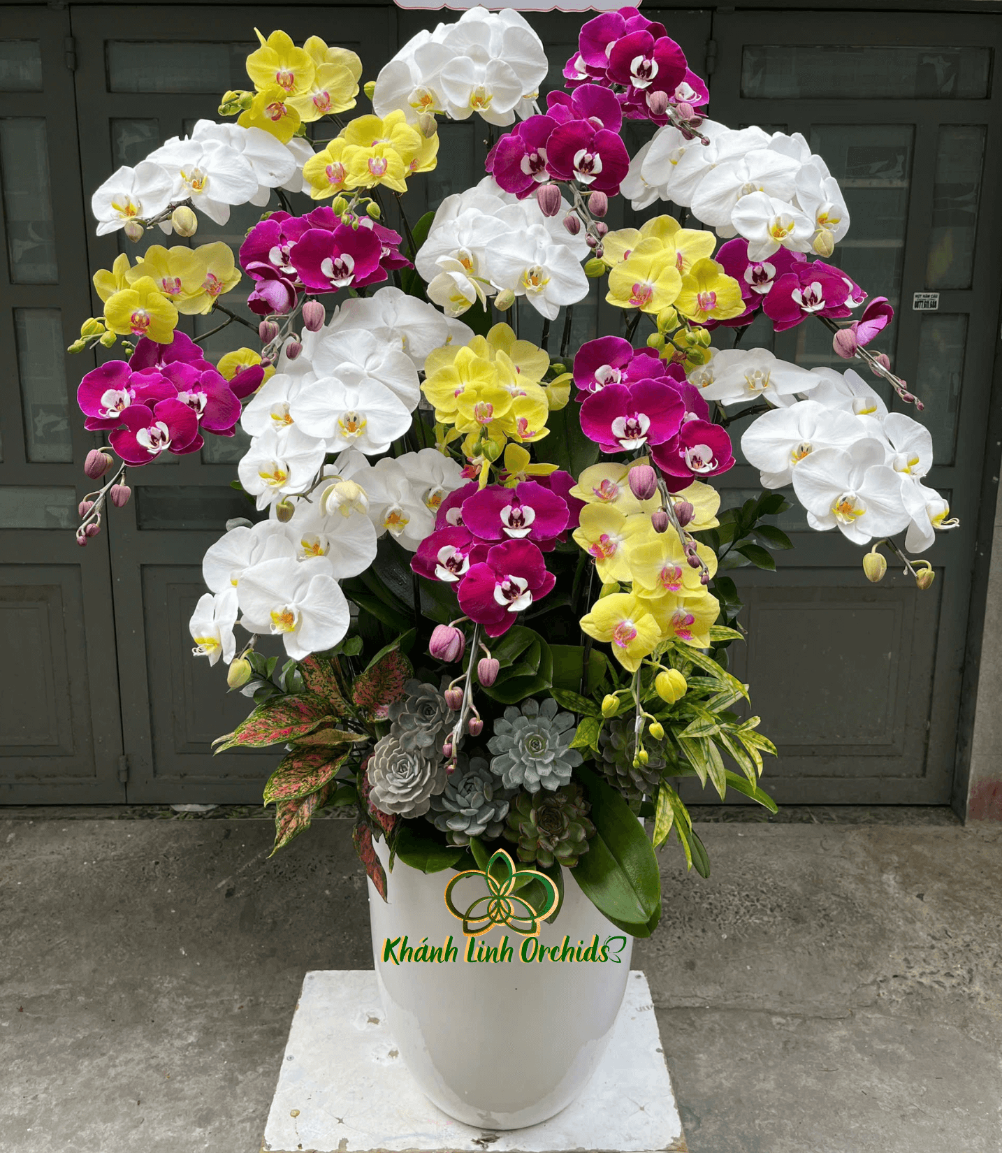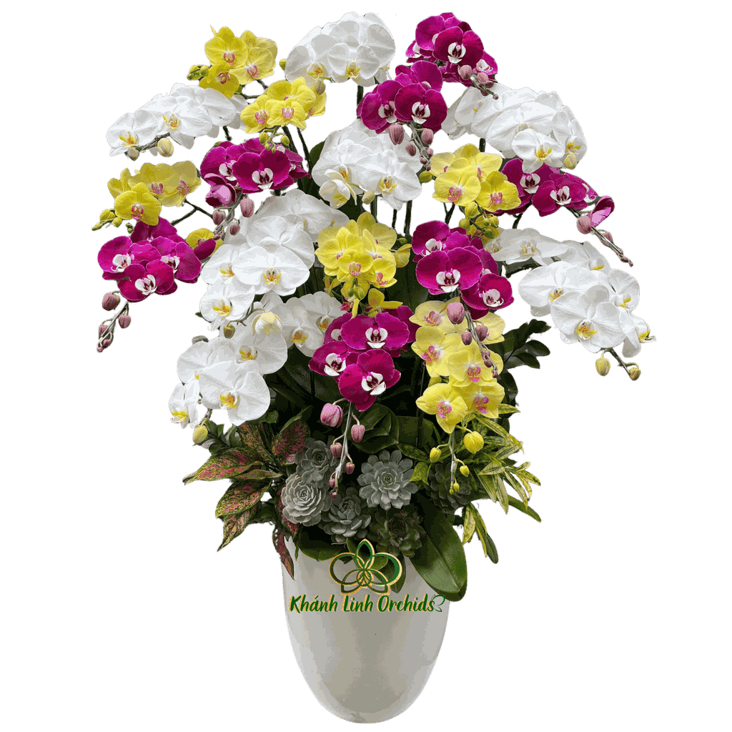 20 cành lan được cắm theo bố cục tầng lớp, tỏa tròn và xòe rộng, tạo cảm giác căng tràn sức sống và vững chãi. Sắc trắng tượng trưng cho sự khởi đầu thuận lợi, sắc vàng gợi tài lộc và may mắn, trong khi tím hồng lại mang thông điệp về tình yêu bền chặt và hạnh phúc viên mãn. Khi kết hợp lại, chậu hoa không chỉ đẹp về hình thức mà còn chứa đựng nhiều giá trị phong thủy tốt lành.