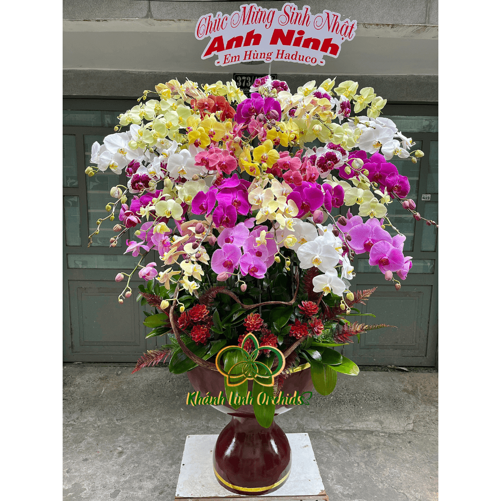 Chậu Lan Hồ Điệp phối màu ngẫu nhiên với 35 cành mang đến một vẻ đẹp đa sắc, rực rỡ nhưng vẫn giữ được sự hài hòa và sang trọng. Mỗi cành lan trong chậu hoa được chọn lựa kỹ lưỡng, với những sắc màu đa dạng từ trắng thanh khiết, vàng ấm áp, tím lãng mạn đến hồng ngọt ngào, tạo nên một bức tranh thiên nhiên sống động và tươi mới.