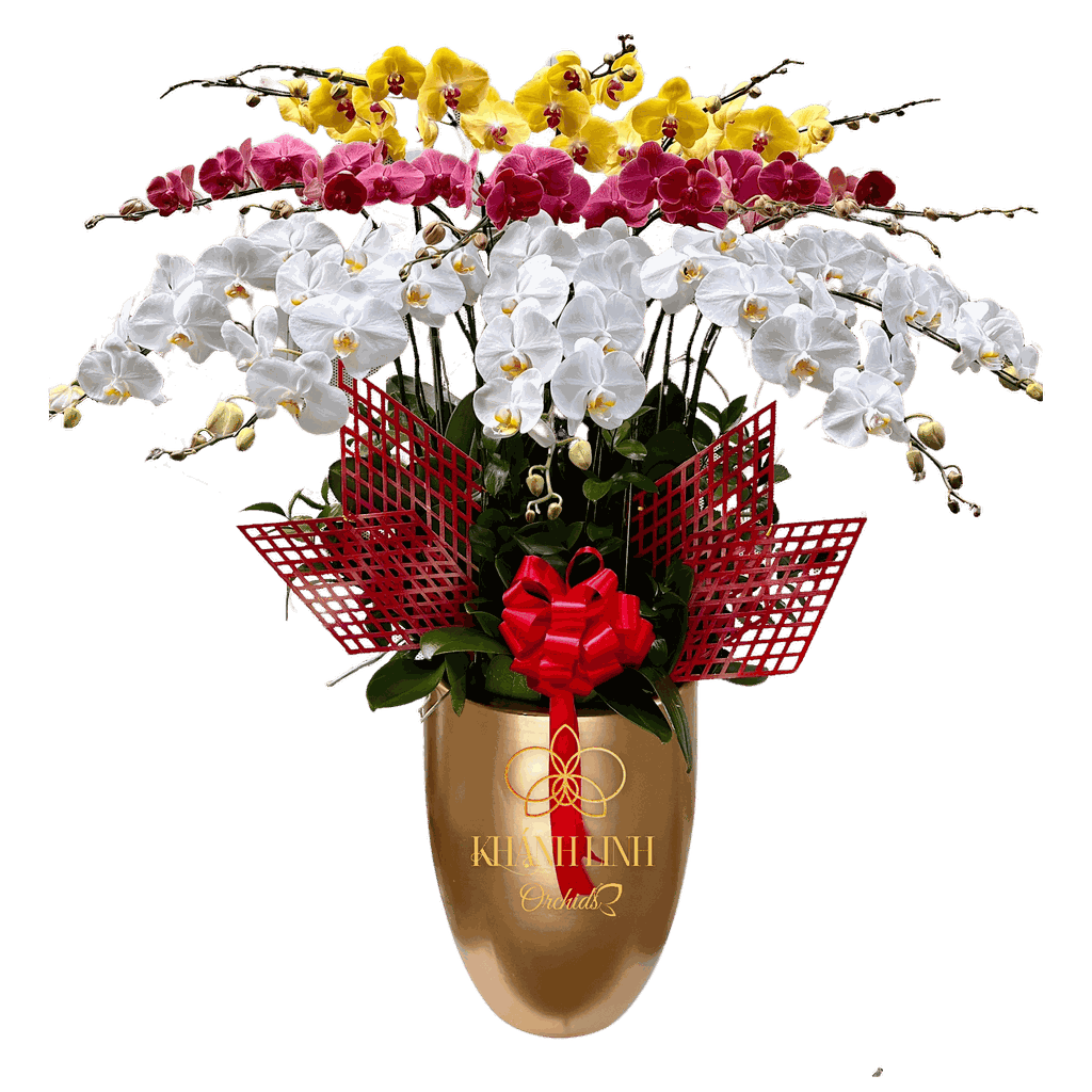Chậu Hoa Lan Hồ Điệp Phối Màu Đỏ Vàng Trắng 17 Cành là một kiệt tác trang trí tinh tế, nơi sự hòa quyện của màu sắc tạo ra một không gian tràn ngập vẻ đẹp quyến rũ và sang trọng. Sự kết hợp độc đáo của màu đỏ, vàng và trắng tạo ra một bức tranh màu sắc tinh tế và hấp dẫn. Mỗi cành hoa như một tác phẩm nghệ thuật, làm cho không gian trở nên sống động và phong cách. Sự sắp xếp cân đối của 17 cành hoa tạo ra một bố cục độc đáo và hài hòa. Mỗi cành hoa, mỗi bông đều đóng góp vào sự hòa quyện chung, tạo nên một tác phẩm trang trí đẳng cấp. Mỗi đóa hoa và lá xanh được thiết kế với chi tiết mảnh mai và quyến rũ. Cánh hoa đỏ, vàng và trắng kết hợp tạo nên một hình ảnh quyến rũ và phong cách.