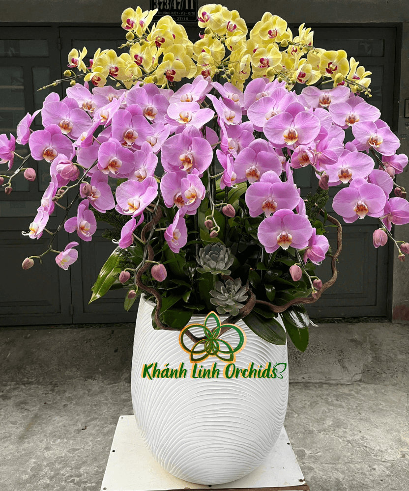 Chậu hoa được cắm trong chiếc chậu xi măng nhẹ cao cấp, đơn giản nhưng tinh tế, giúp làm nổi bật vẻ đẹp của những cánh hoa. Xung quanh gốc lan, những cây sen đá xanh và các chi tiết gỗ uốn lượn mềm mại, tạo nên sự kết hợp hoàn hảo giữa thiên nhiên và nghệ thuật, làm tăng thêm phần sinh động và ấm áp cho chậu hoa. Chậu hoa Lan Hồ Điệp Phối Màu Hồng Và Vàng 20 Cành không chỉ là món quà tuyệt vời để dâng tặng, mà còn là biểu tượng của sự thịnh vượng, hạnh phúc và may mắn, mang lại vẻ đẹp tươi mới và tràn đầy sức sống cho không gian sống.