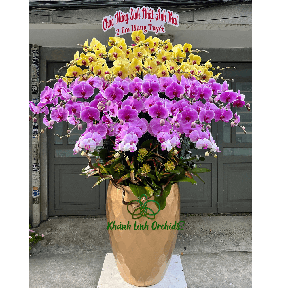 Phía dưới, chậu hoa được cắm trong chậu compsite phun màu vàng đồng cao cấp, tôn lên vẻ đẹp sang trọng của tổng thể. Chậu hoa lan không chỉ là điểm nhấn hoàn hảo cho không gian sống mà còn thể hiện thông điệp về sự hưng thịnh, may mắn và niềm vui lan tỏa. Đây là một món quà đẳng cấp, thích hợp cho những dịp đặc biệt, mang lại sự tươi mới và phúc lộc cho gia chủ.