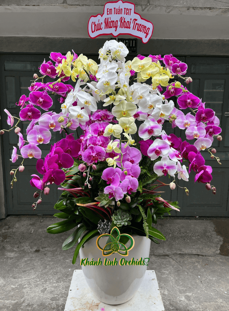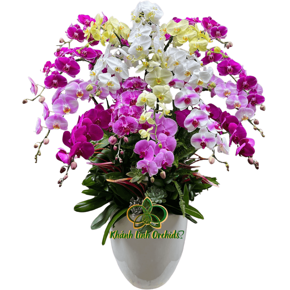 Chậu hoa Lan Hồ Điệp với 18 cành được phối màu ngẫu nhiên như một bức tranh đa sắc, rực rỡ và độc đáo, thu hút mọi ánh nhìn. Từng cành lan trong chậu mang một sắc màu riêng nhưng vẫn cùng lấy tone hồng tím làm chủ đạo, từ sắc xanh bơ tươi sáng, hồng dịu dàng, đến tím đậm quyến rũ và trắng tinh khôi, tạo nên một tổng thể hài hòa và nổi bật. Các bông lan được cắm trong chậu trắng cao cấp, dáng thon cao cả chậu khoảng 1m4, mang đến sự thanh nhã và tinh tế.