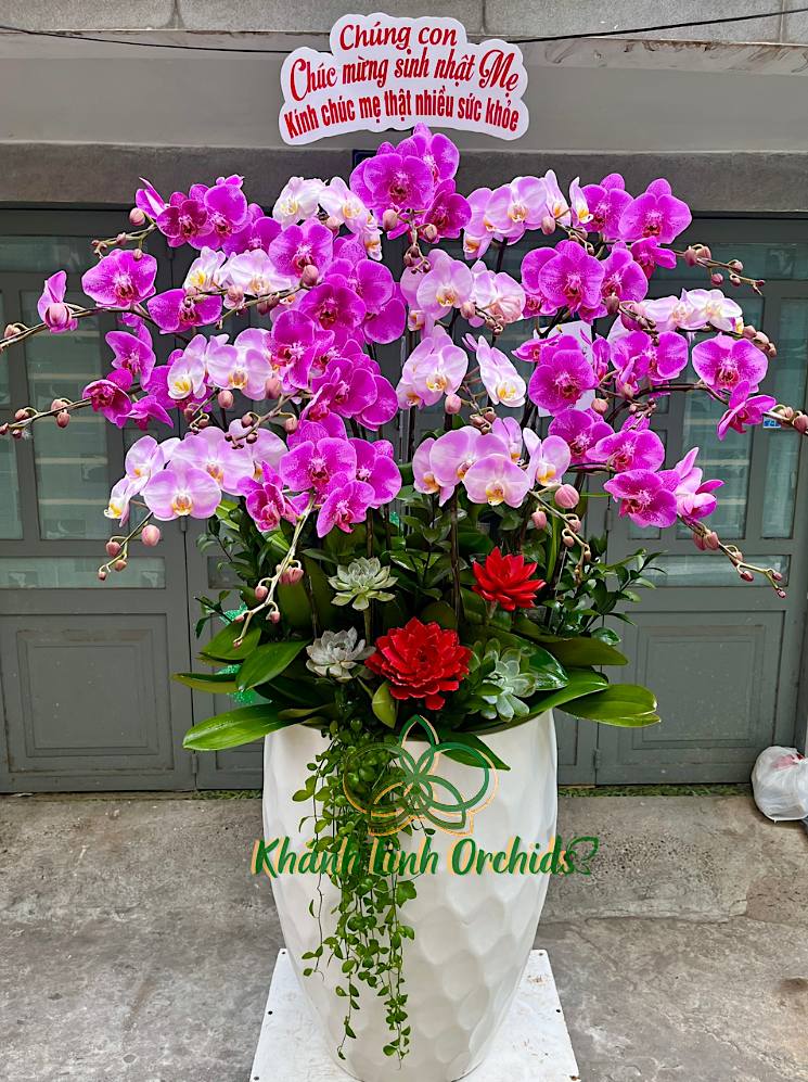 Trang trí thêm bằng những chậu sen đá phun màu xanh tươi mát và lá cảnh rũ dài, mang đến sự cân bằng và điểm nhấn cho chậu lan. Sen đá xanh mướt với vẻ đẹp cứng cáp và bền bỉ, kết hợp với lá cảnh rũ dài như những dòng suối xanh, tạo ra một cảm giác thư thái và hài hòa, làm nổi bật vẻ đẹp mềm mại của hoa lan.