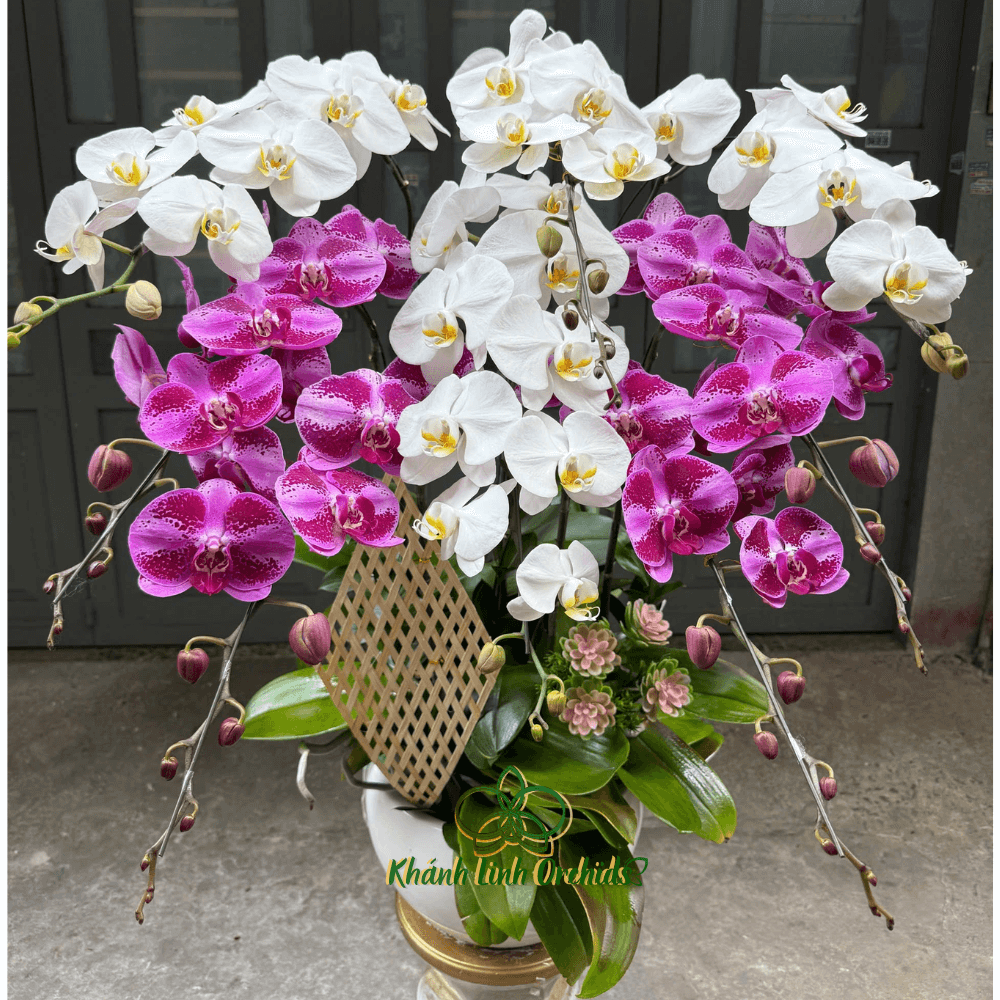 Chậu hoa Lan Hồ Điệp Phối Màu Nhị Sắc 8 Cành này không chỉ là món quà tinh tế mà còn là biểu tượng của sự sang trọng, quý phái. Sự hòa quyện giữa các yếu tố thiên nhiên như hoa Lan Hồ Điệp, sen đá và tre đan mang đến một không gian sống đầy màu sắc, tươi mới, đồng thời thể hiện sự khéo léo và chăm chút trong từng chi tiết.