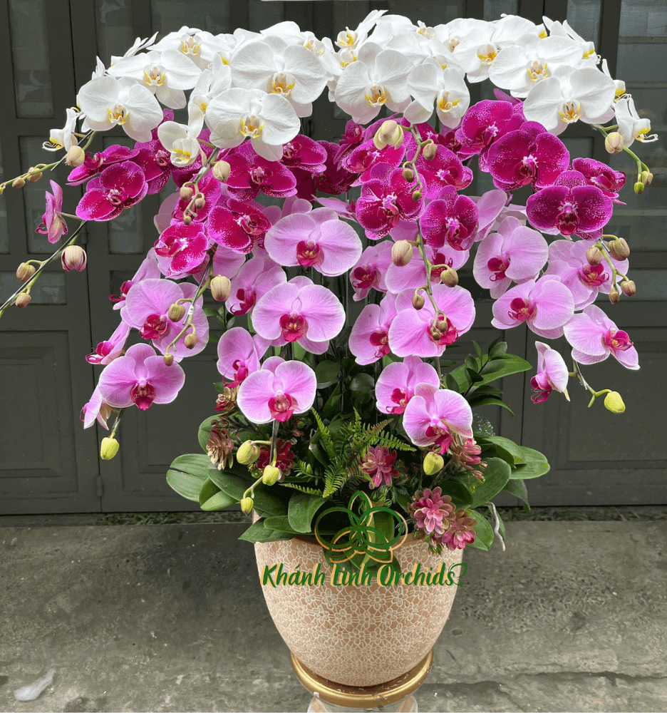 Chậu hoa Lan Hồ Điệp Phối Màu Tam Sắc 12 Cành là một tuyệt tác hoa nghệ thuật, mang đến vẻ đẹp rực rỡ, hài hòa và đầy sang trọng. Sự kết hợp tinh tế giữa ba gam màu độc đáo: trắng tinh khôi, tím đột biến huyền bí và hồng ngọt ngào tạo nên một tổng thể vô cùng cuốn hút và nổi bật. Sắc trắng tượng trưng cho sự thuần khiết, tinh tế và thanh cao, làm nền để các gam màu khác tỏa sáng.Tím đột biến mang vẻ đẹp huyền bí, sang trọng, thể hiện sự quyến rũ và quyền lực.Hồng dịu dàng mang đến cảm giác ấm áp, hạnh phúc và may mắn, làm chậu hoa trở nên mềm mại và tươi tắn hơn.