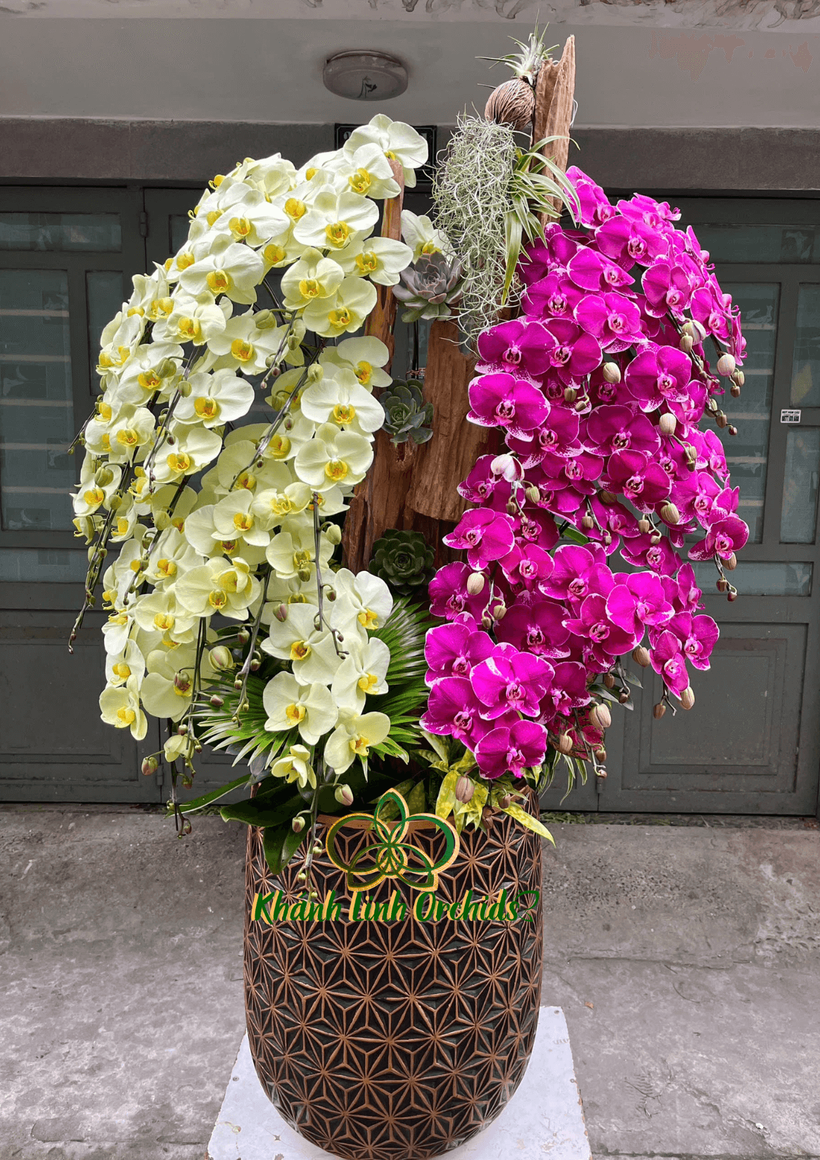 Với 28 cành hoa được cắm tỉ mỉ, chậu lan mang ý nghĩa phong thủy đặc biệt: số 28 tượng trưng cho “phát tài, thịnh vượng lâu bền”. Kết hợp cùng tiểu cảnh xanh mát, sen đá và gỗ lũa tự nhiên, tổng thể trở nên sang trọng, cuốn hút và đầy sức sống.