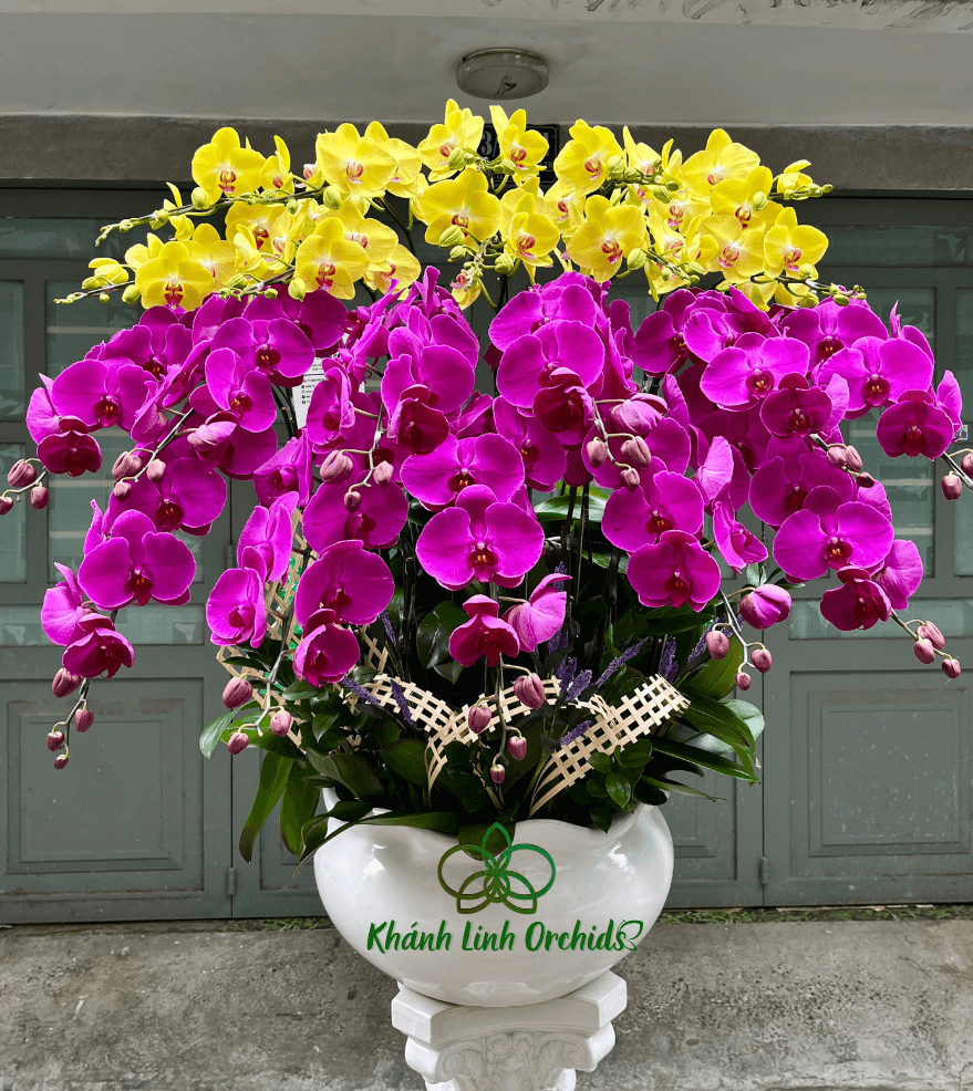 Cách sắp xếp khéo léo các cành hoa tạo nên sự cân đối và hài hòa, với từng bông hoa đều tỏa ra vẻ đẹp riêng biệt nhưng lại góp phần tạo nên một tổng thể hoàn mỹ. Chậu Lan Hồ Điệp phối hai màu này không chỉ là một món trang trí bắt mắt mà còn là biểu tượng của tình yêu, sự thịnh vượng và niềm vui. Sự kết hợp giữa sắc vàng rực rỡ và tím đậm đầy bí ẩn mang đến cho không gian sự sang trọng và ấm cúng, rất thích hợp cho những dịp lễ hội, kỷ niệm hay chỉ đơn giản là làm đẹp cho ngôi nhà.
