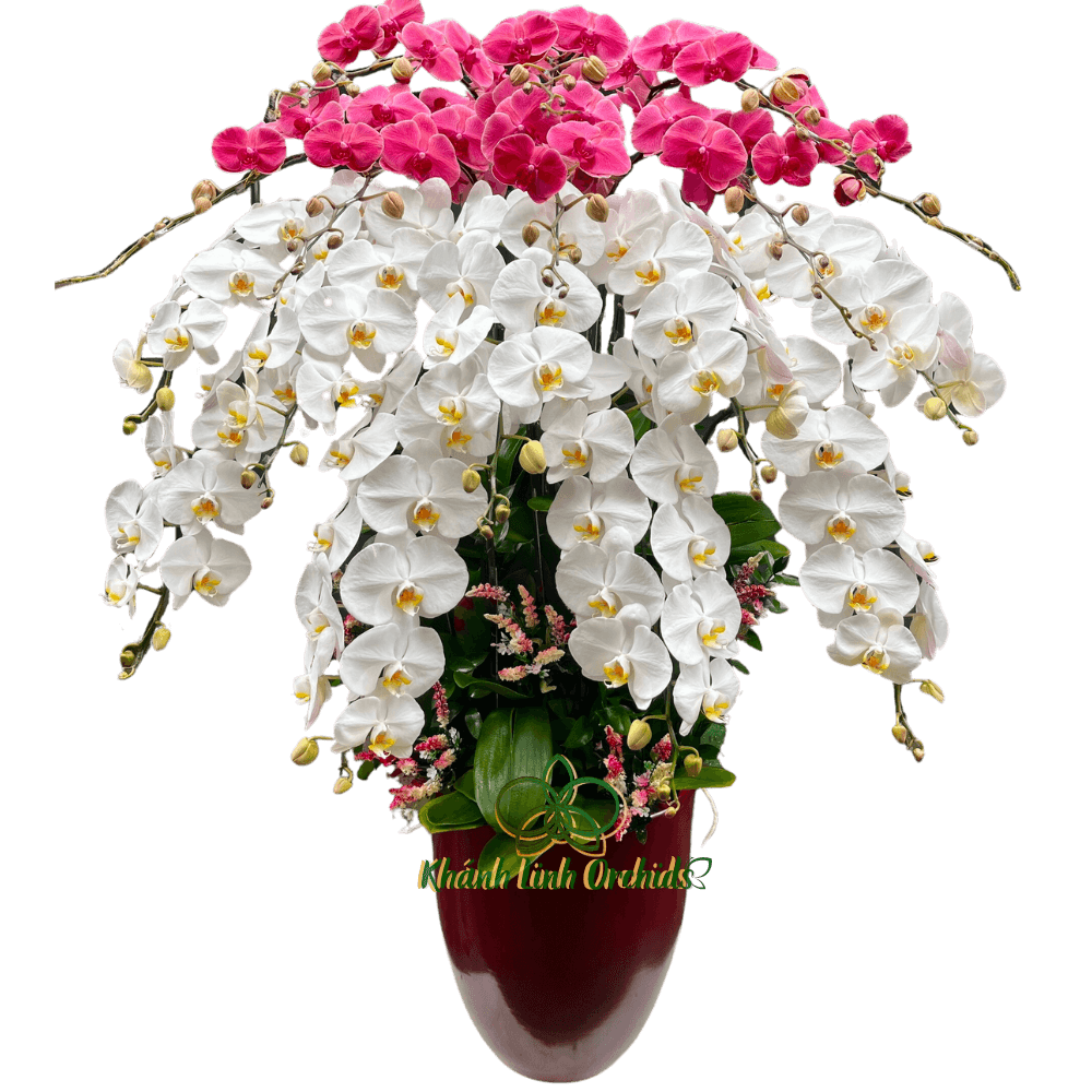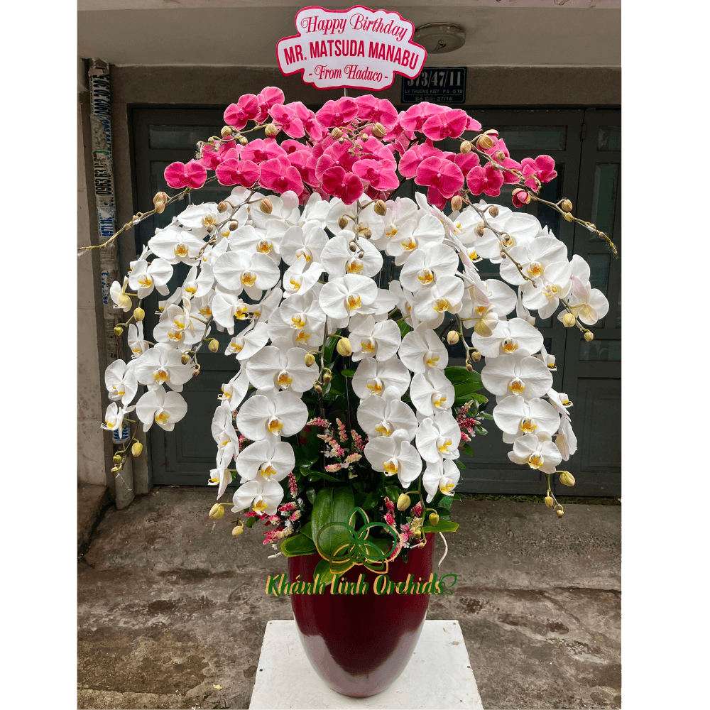 Chậu Lan Hồ Điệp phối màu trắng và cam với 17 cành là sự kết hợp hoàn hảo giữa sự tinh khiết của màu trắng và sự ấm áp, rực rỡ của sắc cam. Những cánh hoa trắng tinh khôi nổi bật bên cạnh những bông hoa cam nồng nàn, tạo nên một sự đối lập đầy cuốn hút, vừa tươi sáng lại vừa nổi bật.