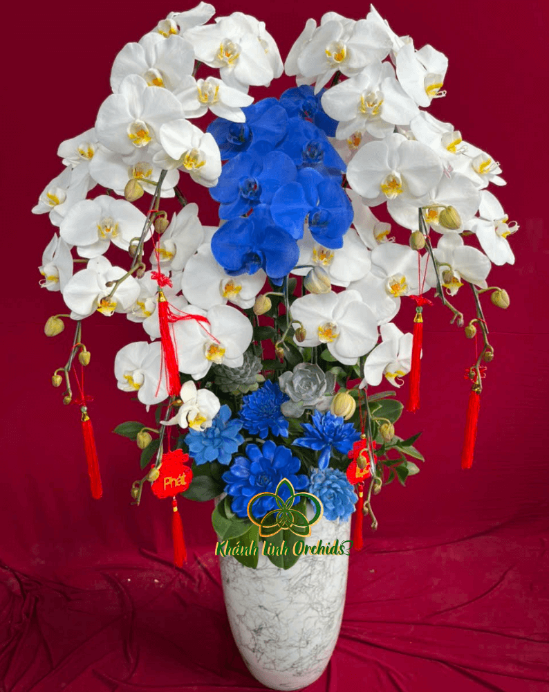 Chậu hoa được cắm trong một chậu cao trắng với những đường vân đen đặc sắc, tạo nên sự nổi bật và thanh thoát cho tổng thể. Chậu trắng đơn giản nhưng không kém phần sang trọng, tôn lên vẻ đẹp của từng bông hoa. Đặc biệt, dưới gốc được trang trí những cây sen đá phun màu xanh, đồng điệu với sắc xanh của hoa, mang đến cảm giác tự nhiên, tươi mới. Cùng với đó, việc trang trí liễng Tết treo thêm mang đến một không gian thêm phần ấm áp, trang trọng, tạo sự hòa quyện giữa nét đẹp truyền thống và hiện đại. Chậu hoa Lan Hồ Điệp Phối Màu Trắng, Xanh Biển 7 Cành là lựa chọn hoàn hảo cho những dịp lễ Tết, mang đến sự thịnh vượng và may mắn cho không gian sống.