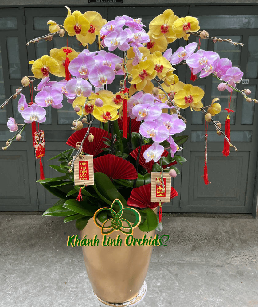 Chậu hoa được cắm trong chiếc chậu cao phun màu vàng đồng, với lớp màu bóng bẩy, sang trọng, làm nổi bật sắc hoa Lan Hồ Điệp một cách tuyệt vời. Chậu cao, thanh thoát với gam màu vàng đồng, giúp tạo nên một sự kết hợp hài hòa, vừa sang trọng, vừa gần gũi, tô điểm thêm vẻ đẹp của không gian sống. Trang trí những chiếc liễng Tết nhỏ xinh, mang theo những lời chúc phúc may mắn cho gia chủ trong năm mới. Cùng với đó là những chiếc quạt giấy đỏ được xếp thủ công, tỉ mỉ và tinh tế, tạo nên một không gian Tết đầy sắc màu, rộn ràng và phấn khởi. Quạt giấy đỏ, với màu sắc tươi tắn, không chỉ là món trang trí đẹp mắt mà còn mang ý nghĩa phong thủy, tượng trưng cho sự tài lộc và may mắn.