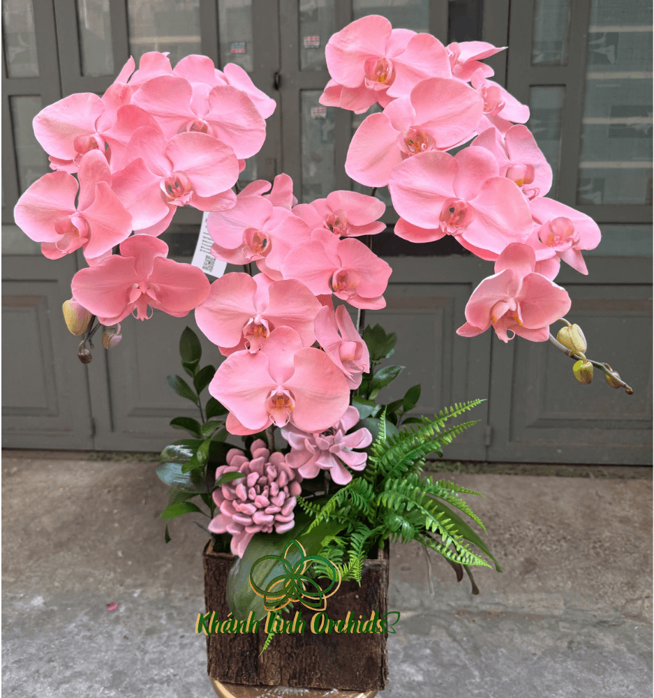 Xung quanh gốc hoa lan, sen đá phun màu hồng pastel được bố trí khéo léo, tạo thêm điểm nhấn nhẹ nhàng và dễ thương, làm tôn lên sự mềm mại của hoa lan. Sự kết hợp giữa sen đá và hoa lan như một biểu tượng của sự hòa hợp giữa vẻ đẹp dịu dàng và sự kiên cường. Thêm vào đó, lá dương xỉ với màu xanh tươi mát như một lớp nền tự nhiên tạo nên một tổng thể hoàn hảo, mang đậm phong cách trang trí hiện đại nhưng vẫn giữ được sự nhẹ nhàng, thanh thoát. Tất cả hòa quyện trong một không gian trang trí đầy lãng mạn, tạo nên cảm giác thư giãn và dễ chịu cho bất kỳ ai chiêm ngưỡng.