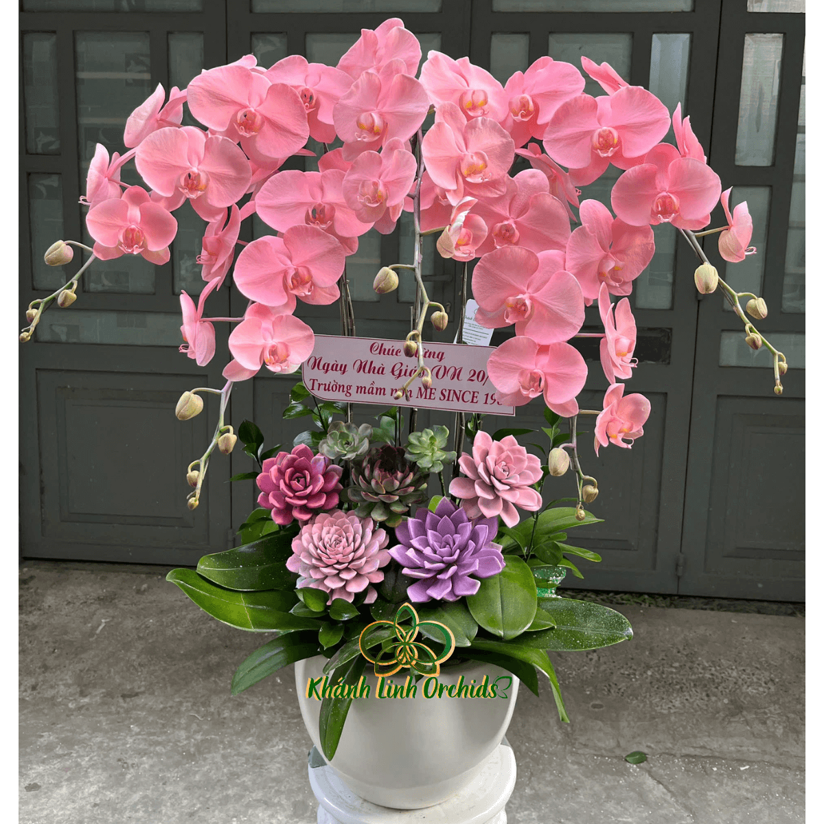 Phần gốc chậu được trang trí bằng các cụm sen đá nhỏ được phun màu nhẹ, phối theo tông pastel đồng điệu với hoa, không chỉ tăng thêm nét độc đáo mà còn mang lại cảm giác gần gũi với thiên nhiên. Sen đá biểu trưng cho sự bền bỉ, lâu dài, khi kết hợp với vẻ đẹp mềm mại của lan tạo nên một tổng thể hài hòa giữa sức sống mạnh mẽ và vẻ đẹp dịu êm.