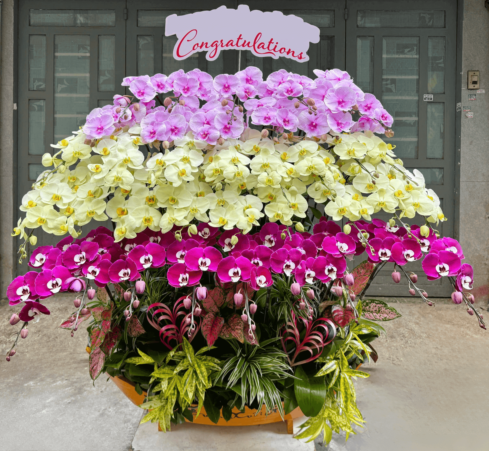 Điểm nhấn nổi bật của chậu hoa là sự phối màu tinh tế giữa ba sắc thái: lan hồ điệp tím ngọc trai quyến rũ, lan xanh bơ dịu dàng và lan hồng phấn ngọt ngào. Ba gam màu hòa quyện tạo nên một tổng thể cân đối, vừa rực rỡ, vừa thanh nhã, tượng trưng cho sự thịnh vượng, may mắn và tình cảm gắn kết bền lâu. Số lượng 39 cành mang ý nghĩa “Thần Tài phù hộ – Tài lộc trường tồn”, thể hiện lời chúc phát đạt, hạnh phúc viên mãn và thành công rực rỡ.