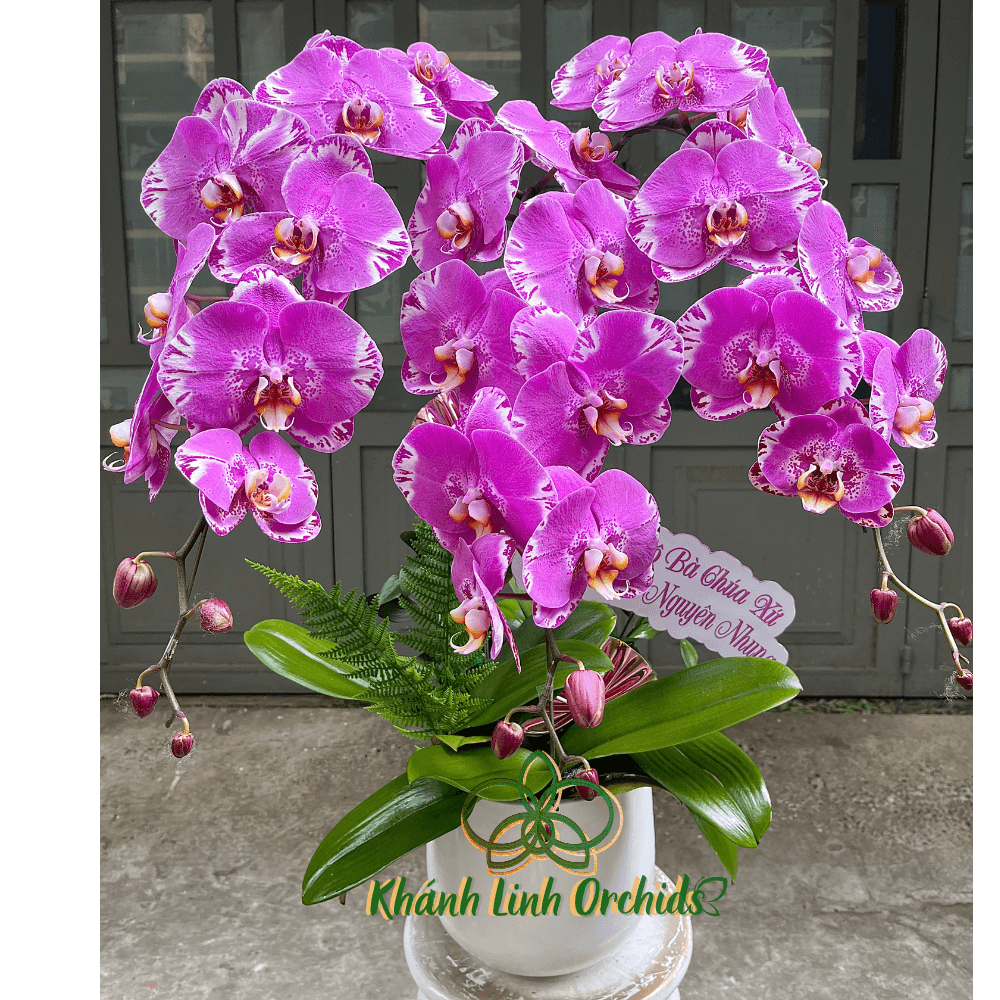 Những cành hoa thanh mảnh, vươn cao nhẹ nhàng nhưng đầy sức sống, thể hiện sự tươi mới và tràn đầy sức sống. Chậu lan không chỉ mang đến vẻ đẹp tự nhiên, mà còn là biểu tượng của sự tinh tế, thanh khiết và thuần khiết.