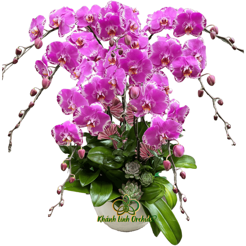 Với chiều cao tổng thể khoảng 1m, chậu hoa tạo điểm nhấn nổi bật nhưng không chiếm quá nhiều không gian, hoàn toàn phù hợp để trưng bày trong phòng khách, văn phòng hay bàn làm việc. Chậu hoa được cắm trong chiếc chậu sứ trắng thấp, thanh thoát, giúp làm nổi bật sắc tím huyền bí của hoa. Xung quanh gốc lan, những cây sen đá được trang trí khéo léo, với sắc xanh mát, tạo sự tương phản nhẹ nhàng và hòa quyện với vẻ đẹp của hoa lan. Tất cả tạo nên một tổng thể hoàn hảo, vừa sang trọng, vừa tinh tế, là một điểm nhấn tuyệt vời cho không gian sống.