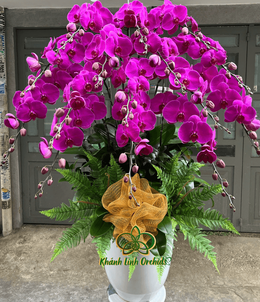 Được cắm trong chiếc chậu trắng cao, vẻ đẹp của hoa Lan Hồ Điệp càng trở nên nổi bật, tôn lên sự thanh thoát và tinh tế. Với chiều cao tổng thể từ 1m3 đến 1m4, chậu hoa mang lại một vẻ đẹp vừa đủ bề thế, vừa thanh lịch, phù hợp để làm điểm nhấn trong những không gian sang trọng như phòng khách, sảnh công ty hay khu vực tiếp khách. Dưới gốc cây, những chiếc lá dương xỉ xanh mát được trang trí một cách khéo léo, phủ kín chân hoa, tạo nên một lớp nền tươi mát và đầy sức sống, làm tăng sự tươi mới cho tổng thể. Chậu hoa Lan Hồ Điệp Tím Đậm không chỉ tinh tế mà còn là biểu tượng của sự sang trọng, kiêu hãnh và vẻ đẹp vĩnh cửu.