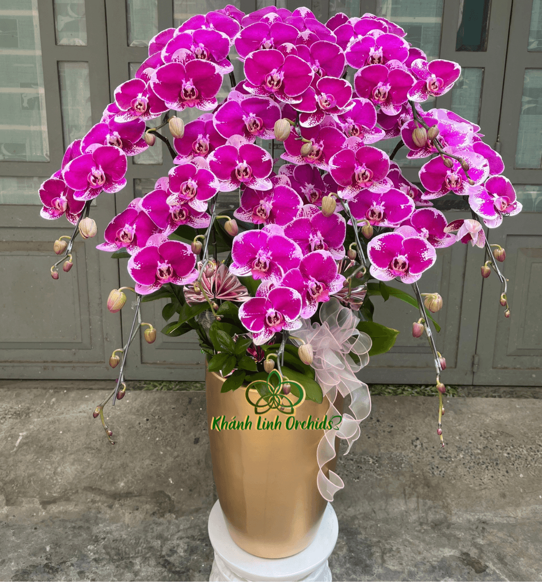 Phần trang trí quạt hồng và nơ voan được xử lý tinh tế, không quá cầu kỳ nhưng đủ để tạo điểm nhấn mềm mại cho tổng thể. Sự kết hợp này giúp chậu lan trở nên nhẹ nhàng, duyên dáng hơn, đồng thời làm nổi bật sắc tím đặc trưng của hoa. Chậu cao phun vàng đồng mang lại cảm giác sang trọng, hiện đại, đồng thời nâng tầm toàn bộ bố cục, giúp chậu hoa trở nên nổi bật và thu hút hơn trong không gian.