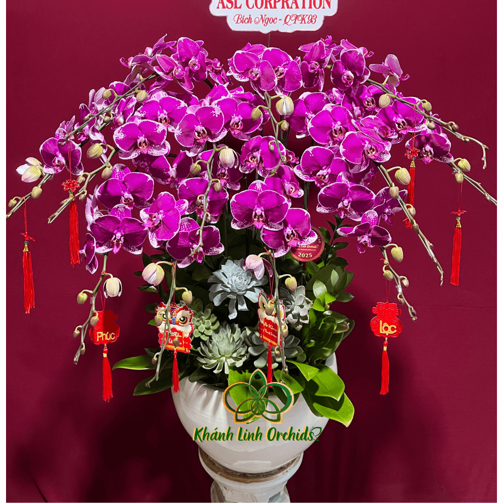 Hoa được cắm trong một chậu trắng thấp, giúp tôn lên vẻ đẹp tự nhiên và thuần khiết của từng cành hoa tím. Chậu trắng giản dị nhưng lại rất phù hợp với sắc tím đậm, tạo nên một sự cân đối hoàn hảo. Để tăng thêm phần sinh động và tự nhiên, chậu hoa được trang trí với những cây sen đá xanh mướt, đem đến sự tươi mới và hài hòa. Một điểm nhấn đặc biệt là liễng Tết treo nhẹ nhàng, mang lại sự may mắn và tài lộc, đồng thời làm cho chậu hoa trở nên sinh động, ấm cúng hơn. Chậu hoa Lan Hồ Điệp Tím Đột Biến 12 Cành là lựa chọn tuyệt vời cho những không gian cần sự sang trọng, tinh tế và một chút gì đó bí ẩn, quý phái.