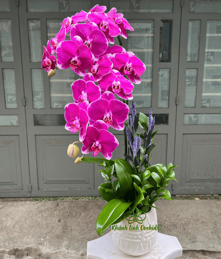 Sự kết hợp giữa hoa Lan Hồ Điệp Tím Đột Biến kiêu sa, chậu trắng thanh lịch và nhánh hoa lavender giả mềm mại tạo thành một tổng thể vô cùng hoàn hảo và lôi cuốn. Đây là món quà tuyệt vời để trang trí không gian sống, mang lại vẻ đẹp sang trọng, huyền bí và đầy lãng mạn.