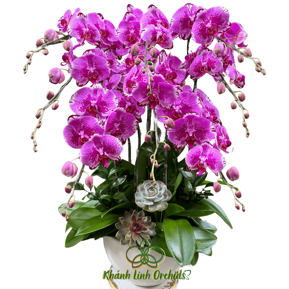 Điểm nhấn đặc biệt trong chậu hoa lan hồ điệp tím đột biến là sự kết hợp hoàn hảo với những cây sen đá xanh mướt. Sen đá với hình dáng nhỏ gọn nhưng đầy sức sống, tượng trưng cho sự bền bỉ và trường thọ, đối lập mà hài hòa với nét kiêu kỳ của lan hồ điệp. Sự phối hợp giữa lan và sen đá tạo nên một tổng thể cân đối, vừa mang nét đẹp thanh thoát, lại vừa có chiều sâu và sự gần gũi với thiên nhiên.
