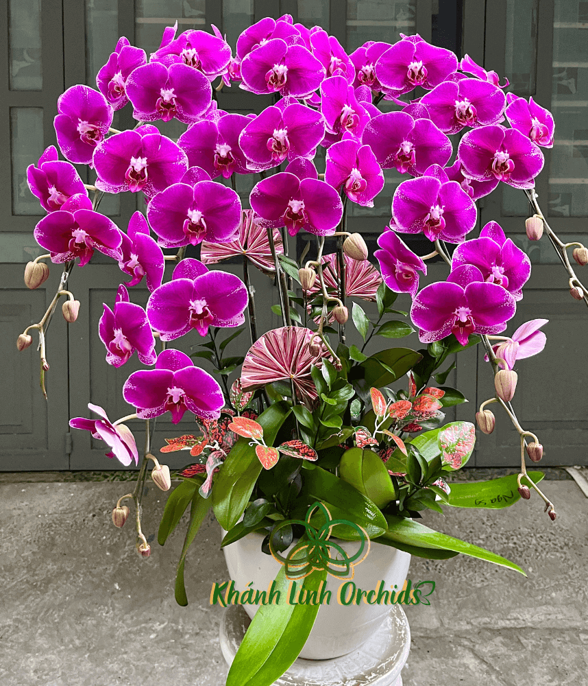 Chậu hoa được cắm trong sứ tắng thấp kiểu dáng trơn đơn giản mà thanh lịch, giúp làm nổi bật lên những đường cong quyến rũ của từng cành lan. Sự hiện diện của chậu Lan Hồ Điệp tím đậm không chỉ mang đến vẻ đẹp thuần khiết, trang nhã mà còn tạo cảm giác sang trọng, trầm tĩnh cho không gian, là lựa chọn lý tưởng để trang trí tại các không gian nội thất sang trọng hoặc làm quà tặng đầy ý nghĩa.