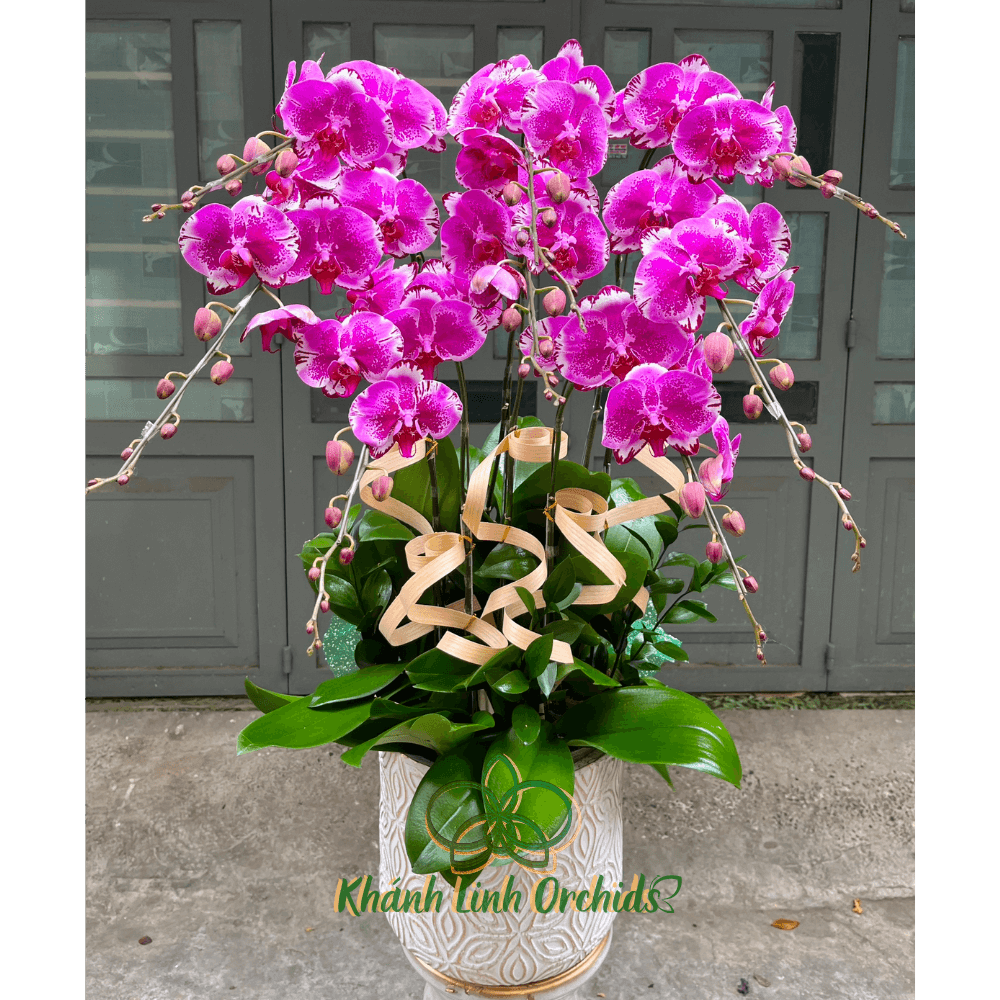 Chậu Lan Hồ Điệp tím với 8 cành mang đến vẻ đẹp lộng lẫy và nổi bật, thu hút ngay từ ánh nhìn đầu tiên. Màu tím đậm đặc trưng với những cánh hoa lan to, dày dặn, tỏa ra sự huyền bí nhưng lại không kém phần thanh thoát.