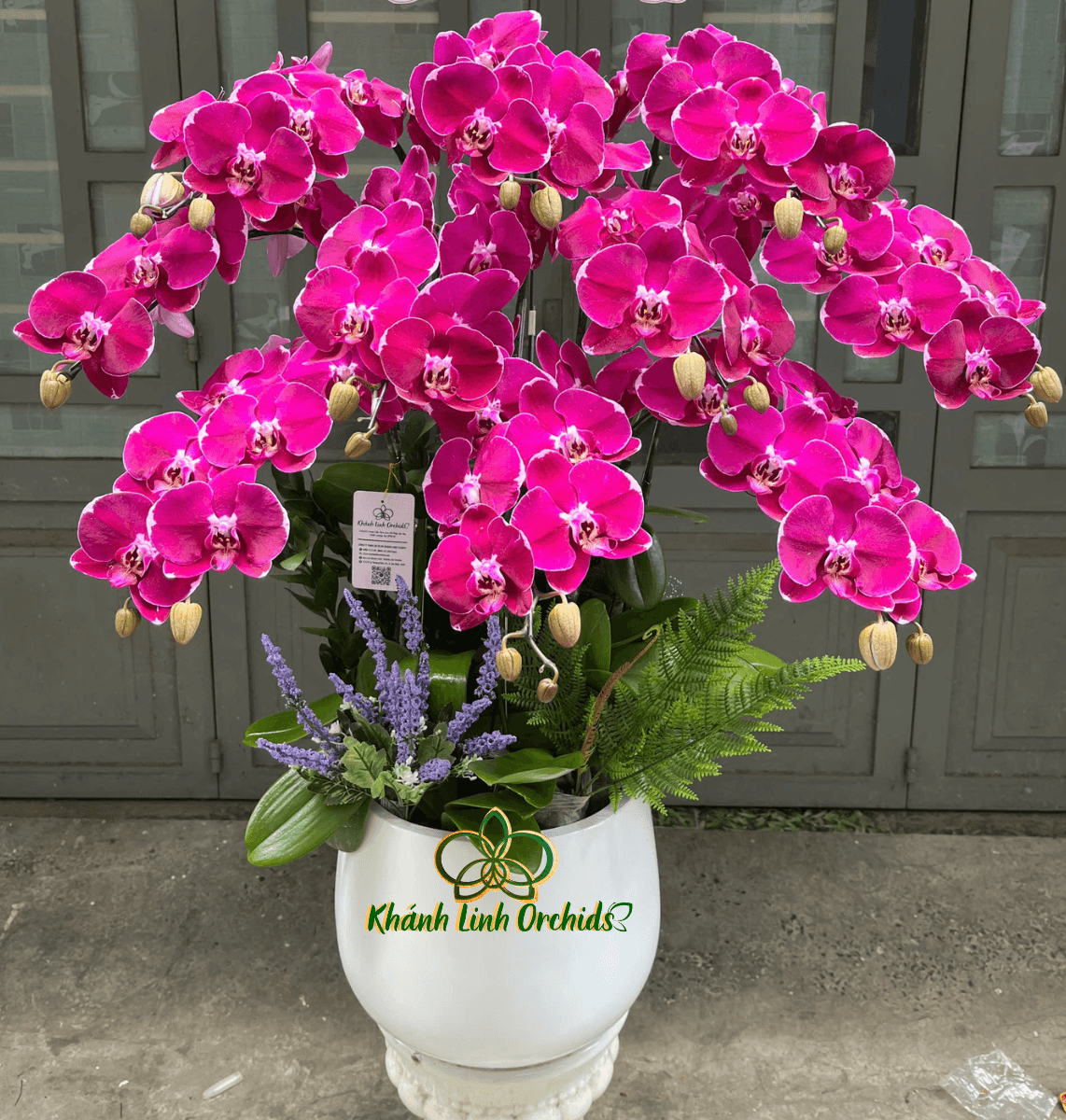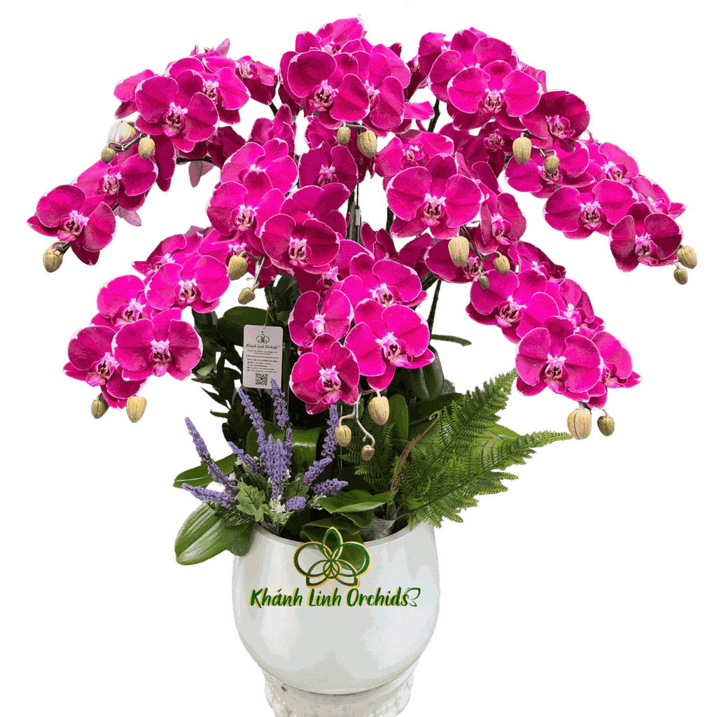 Toàn bộ chậu lan được trồng trong chậu trắng cao với thiết kế thanh lịch và hiện đại. Màu trắng tinh khôi của chậu giúp tôn lên sắc tím hồng nổi bật của hoa lan, đồng thời mang lại vẻ sang trọng và trang nhã cho tổng thể sản phẩm. Dáng chậu cao cũng giúp tôn lên chiều cao và độ mềm mại của các cành lan, khiến chậu hoa trở nên nổi bật hơn khi trưng bày tại phòng khách, sảnh công ty, quầy lễ tân hoặc không gian sang trọng.