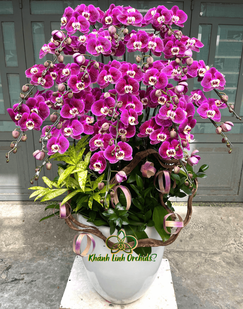 Trang trí bằng dây ruồng uốn lượn nhẹ nhàng cùng lá trúc nhật xanh mướt, chậu hoa thêm phần sinh động và cân bằng, tạo cảm giác gần gũi nhưng vẫn đầy tinh tế. Đây không chỉ là một chậu lan, mà còn là lời gửi gắm về tình yêu bền vững, lòng trung thành và sự thành đạt. Phù hợp để trang trí không gian sang trọng hoặc làm món quà cao cấp cho những dịp đặc biệt, mang theo thông điệp yêu thương sâu sắc và may mắn lâu dài.