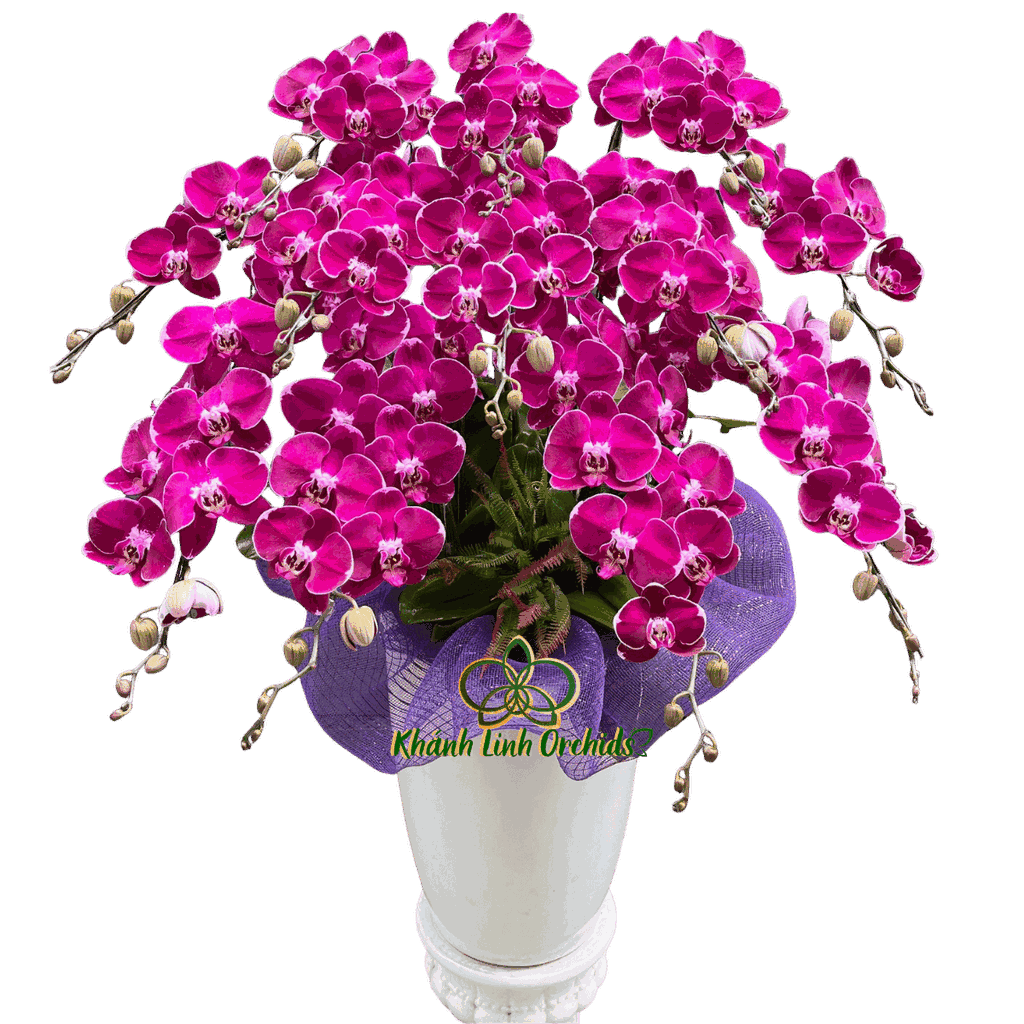 Những bông lan hồ điệp tím nổi bật với sắc tím đậm, cánh hoa tròn đều, bề mặt mịn và độ bền cao. Phần hoa sáng màu giúp từng bông hoa trở nên rõ nét và có chiều sâu. Các cành lan được uốn cong nhẹ nhàng, xen kẽ giữa hoa đã nở và nụ còn khép, mang lại cảm giác tự nhiên và duy trì vẻ tươi mới cho toàn bộ chậu hoa.