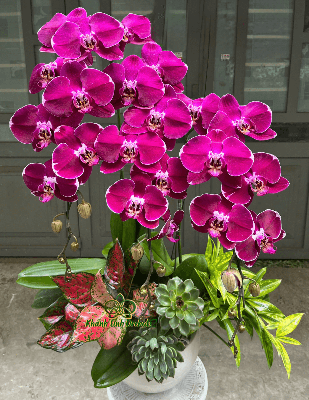 Lan được cắm trong chậu sứ trắng thấp, kiểu dáng trang nhã, giúp tôn lên màu tím sang trọng của hoa. Phần gốc được trang trí khéo léo với sen đá xanh mướt và các loại lá cảnh đa sắc, tạo nên sự hài hòa giữa hoa lan và cây lá, vừa mềm mại vừa hiện đại.