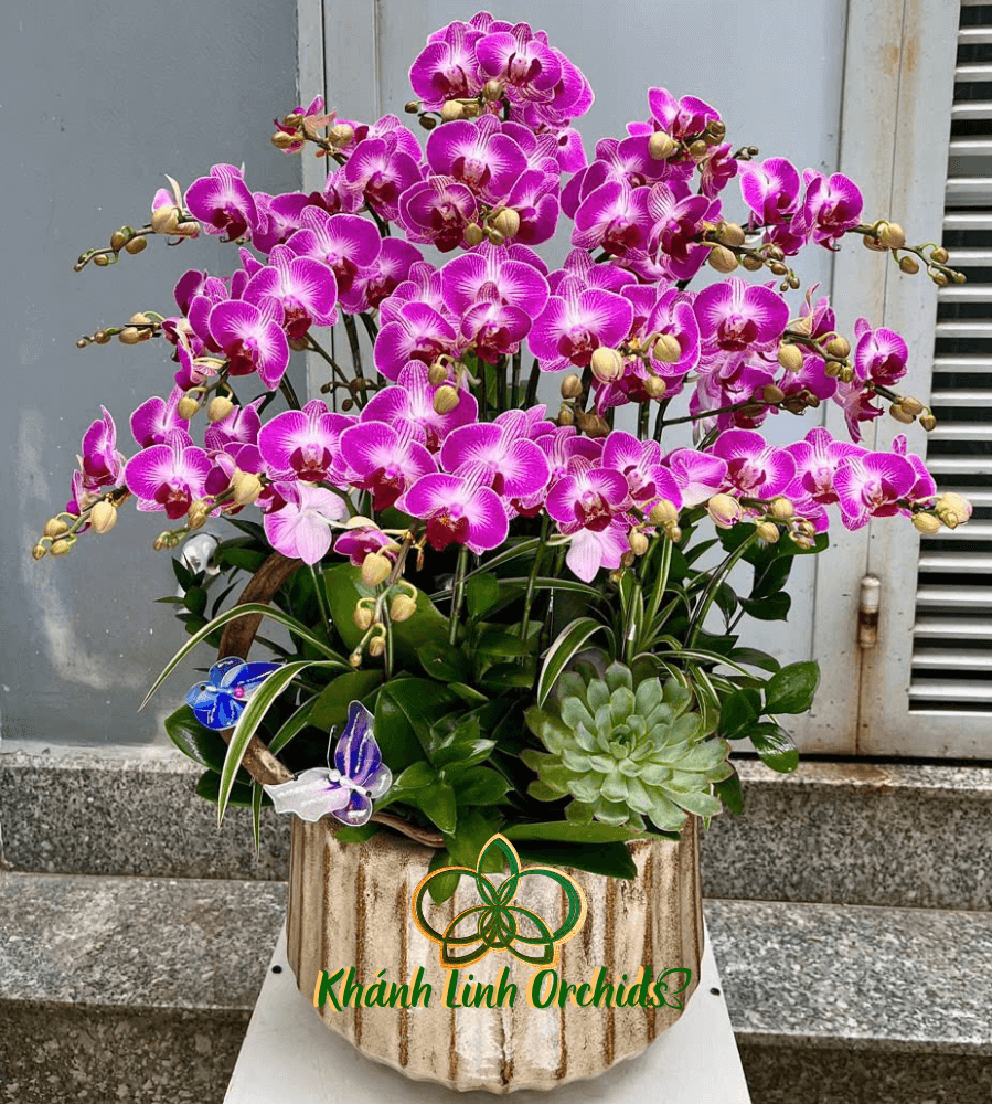 Chậu hoa được cắm trong chậu nâu kem thấp, với họa tiết sọc tinh tế, mang đến sự gần gũi, thanh lịch. Họa tiết này làm nổi bật vẻ đẹp thanh thoát của hoa Lan Hồ Điệp, đồng thời hòa quyện hài hòa với không gian. Để tăng thêm phần sinh động, chậu hoa được trang trí bởi sen đá xanh mướt và những chú bướm nhỏ xinh, tạo nên một bức tranh thiên nhiên sống động, đầy màu sắc. Sự kết hợp hoàn hảo này mang lại cho chậu hoa không chỉ là vẻ đẹp thẩm mỹ mà còn là sự tinh tế, độc đáo mà bất kỳ ai cũng phải trầm trồ khi chiêm ngưỡng. Chậu hoa này là lựa chọn lý tưởng để làm điểm nhấn cho những không gian nhỏ nhưng đầy phong cách.
