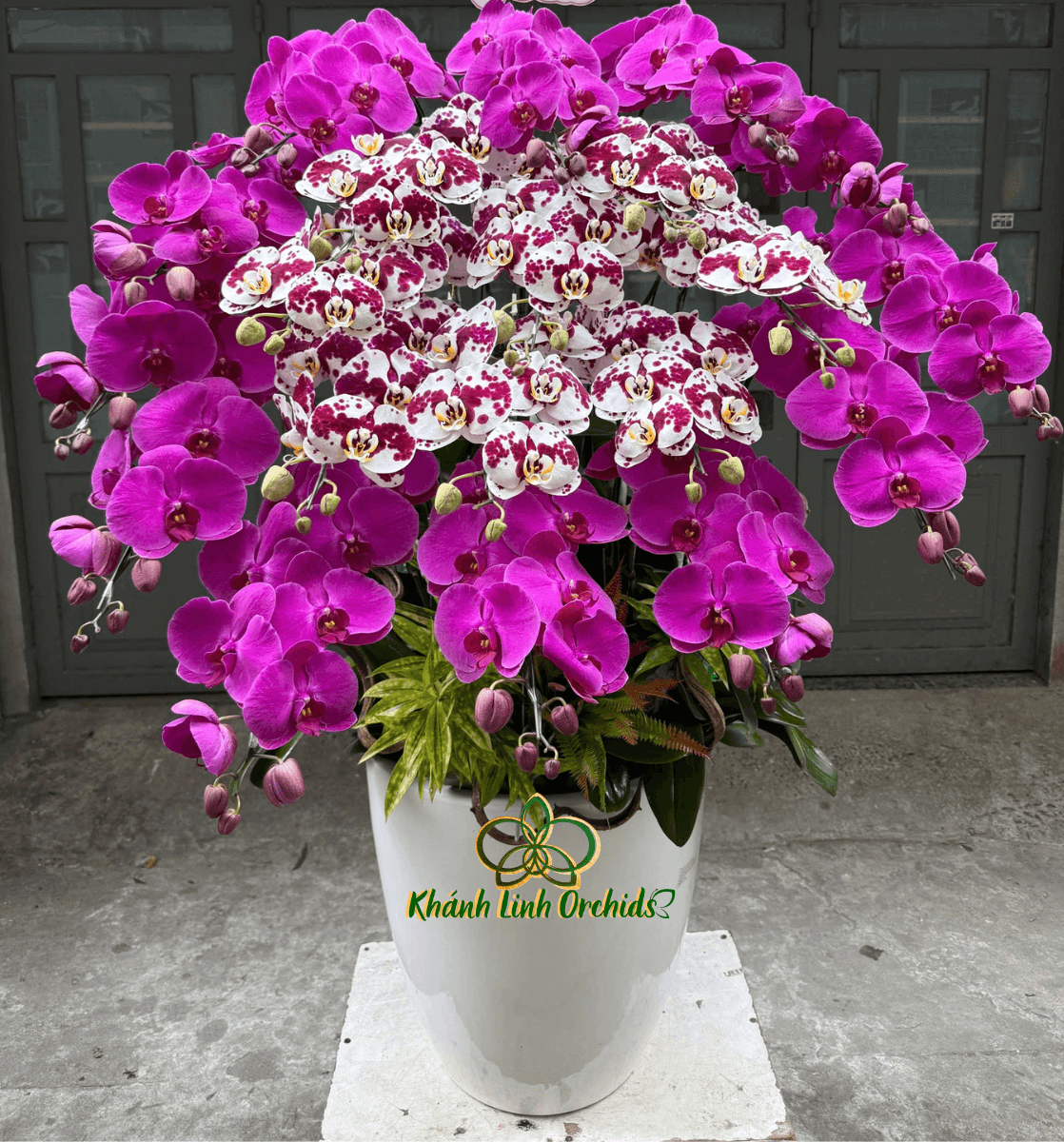 Tổng thể chậu hoa được thiết kế cân đối với bố cục rõ ràng, từng cành lan nở đều, bông to và cánh dày, giúp hoa tươi lâu và giữ được dáng đẹp trong thời gian dài. Lớp cây nền trang trí như dương xỉ và các loại lá màu tạo điểm nhấn tự nhiên, giúp chậu hoa hài hòa và bắt mắt hơn.