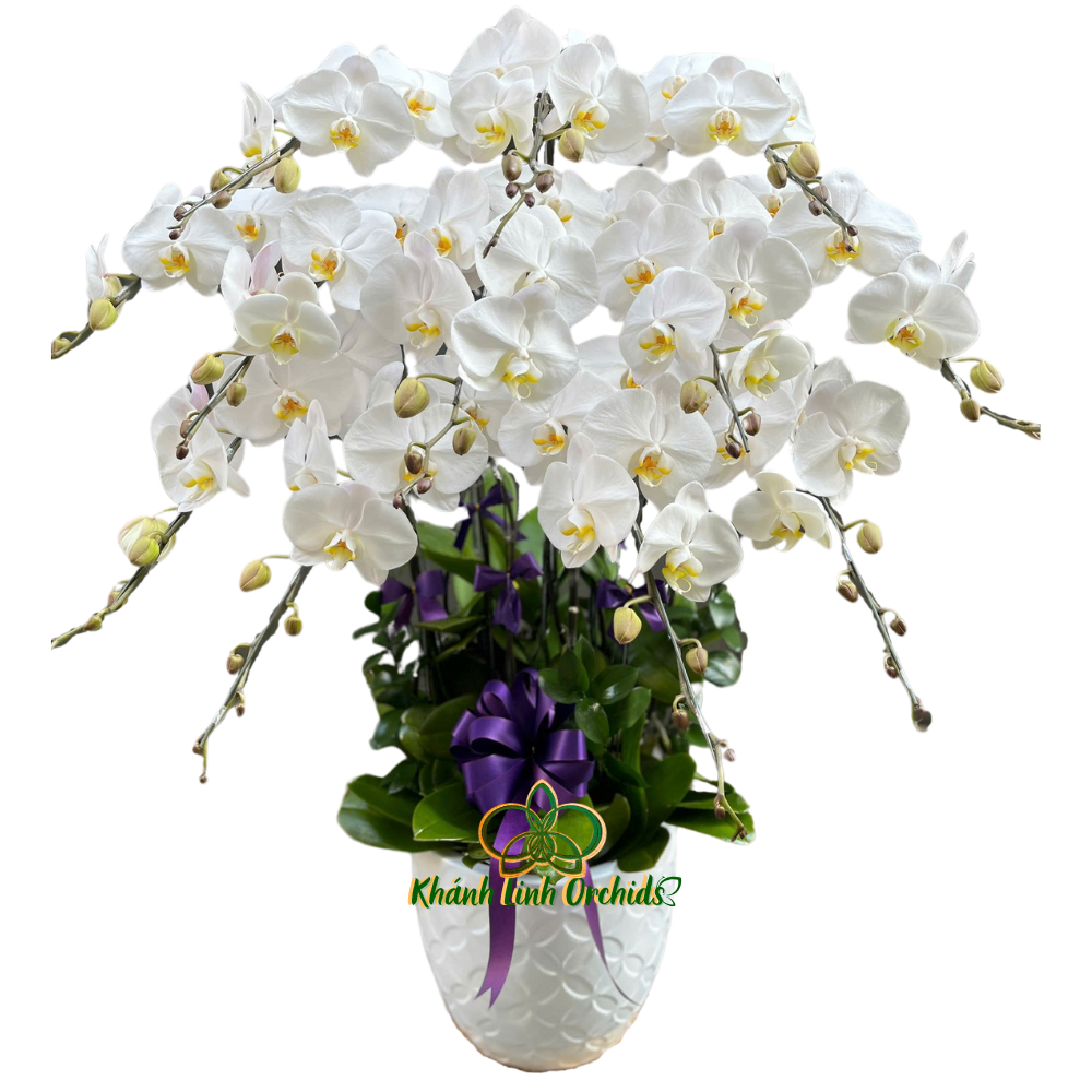 Chậu hoa được cắm trong một chậu trắng thấp, giản dị nhưng đầy sang trọng, với chiều cao tổng thể khoảng 1m-1m2, tạo nên sự cân đối hoàn hảo giữa hoa và chậu. Đặc biệt, một dải ruy băng tím được thắt chính giữa chậu, mang đến điểm nhấn mềm mại, tinh tế, đồng thời tạo sự hòa quyện giữa sắc trắng thuần khiết của hoa và sự sang trọng của màu tím. Sự kết hợp này không chỉ làm nổi bật vẻ đẹp của hoa mà còn thể hiện sự tôn trọng, kính trọng dành cho người nhận. Chậu hoa Lan Hồ Điệp Trắng 12 Cành chính là món quà hoàn hảo để gửi gắm những thông điệp trang trọng, chân thành và đầy ý nghĩa.
