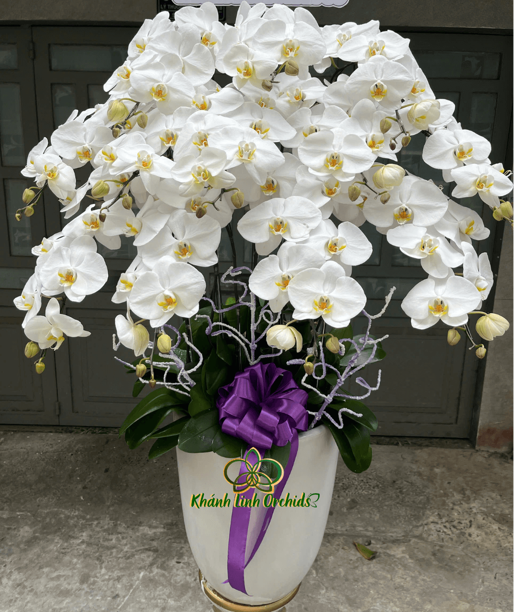 Với kiểu dáng thác đổ mềm mại, chậu lan mang đến cảm giác thanh thoát, trang nghiêm nhưng không quá u buồn. Được cắm trong chậu sứ trắng cao cấp, điểm xuyết chiếc nơ tím – biểu tượng của sự tôn kính và trân trọng – chậu hoa thể hiện tấm lòng chân thành và sự tiễn đưa đầy ý nghĩa của người ở lại. Đây là món quà hoa tưởng niệm sâu sắc, tinh tế, thể hiện văn hóa hiếu nghĩa và đạo lý "uống nước nhớ nguồn" của người Việt.
