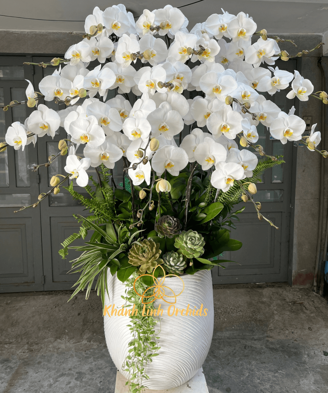 Chậu hoa được cắm trong một chậu composite trắng cao cấp, với thiết kế thanh lịch, giúp làm nổi bật vẻ đẹp của những cành lan. Chậu composite trắng không chỉ tạo nên sự đồng điệu mà còn làm tăng vẻ đẹp hiện đại và tinh tế của chậu hoa.