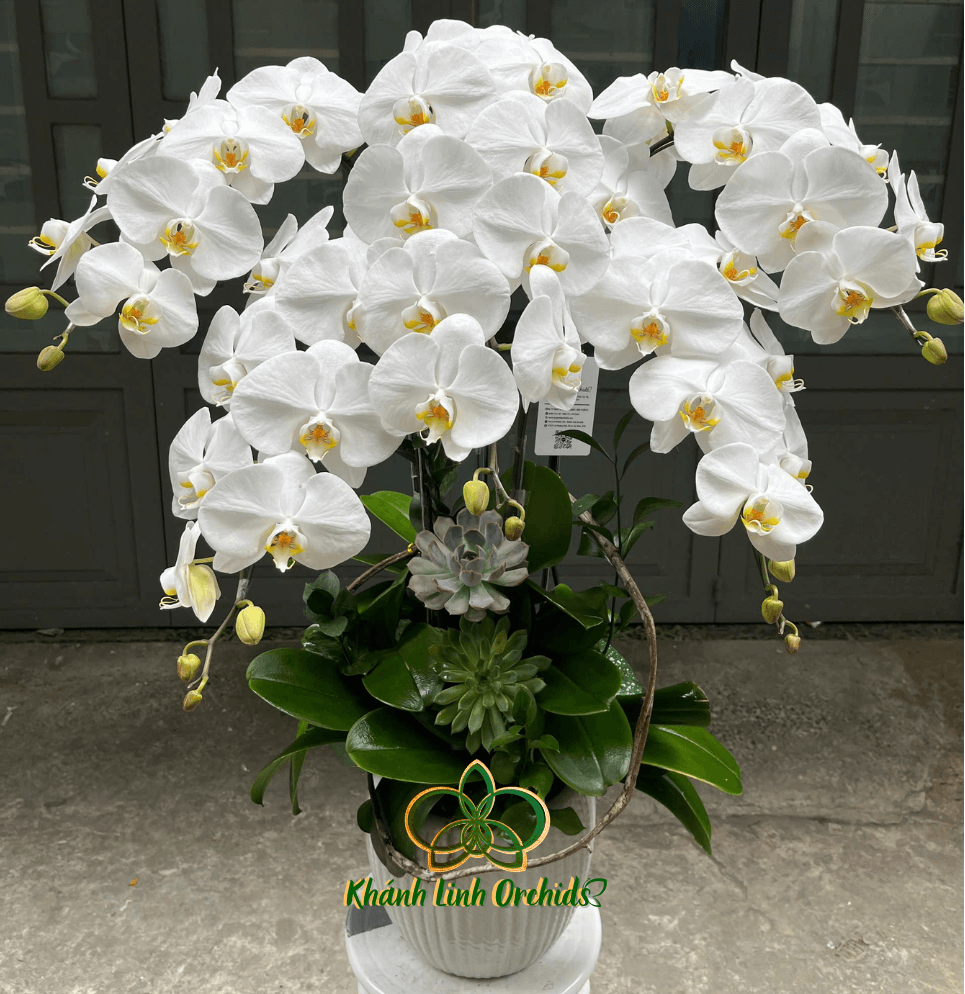 Chậu hoa Lan Hồ Điệp trắng 5 cành mang vẻ đẹp thanh nhã với sắc trắng thuần khiết, làm sáng bừng không gian một cách tinh tế và dịu dàng. Sắc trắng tinh khôi của lan Hồ Điệp, kết hợp cùng các chi tiết trang trí sen đá, mang đến sự tươi mới và tổng thể tự nhiên.