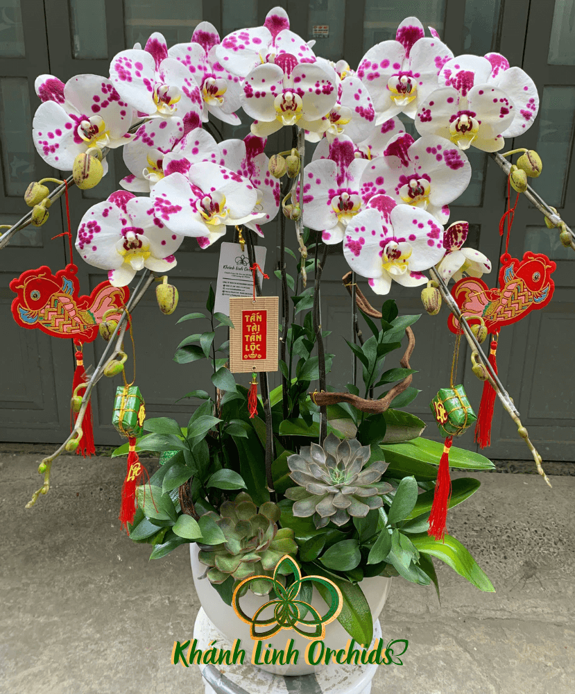 Được cắm trong chiếc chậu trắng thấp thanh thoát, thiết kế đơn giản nhưng đầy tinh tế, tạo nên một không gian nhẹ nhàng, thanh thoát. Bên cạnh đó, sự kết hợp cùng sen đá xanh mướt tạo điểm nhấn mới lạ, mang lại cảm giác gần gũi và tươi mới. Trang trí liễng Tết xung quanh chậu thêm phần sinh động, mang hơi thở của mùa xuân, tạo nên một tổng thể hài hòa, ấm áp, mang lại không khí tươi vui và may mắn cho mọi không gian. Chậu hoa không chỉ đẹp mà còn chứa đựng những lời chúc tốt lành, như một món quà đầy ý nghĩa cho dịp Tết.