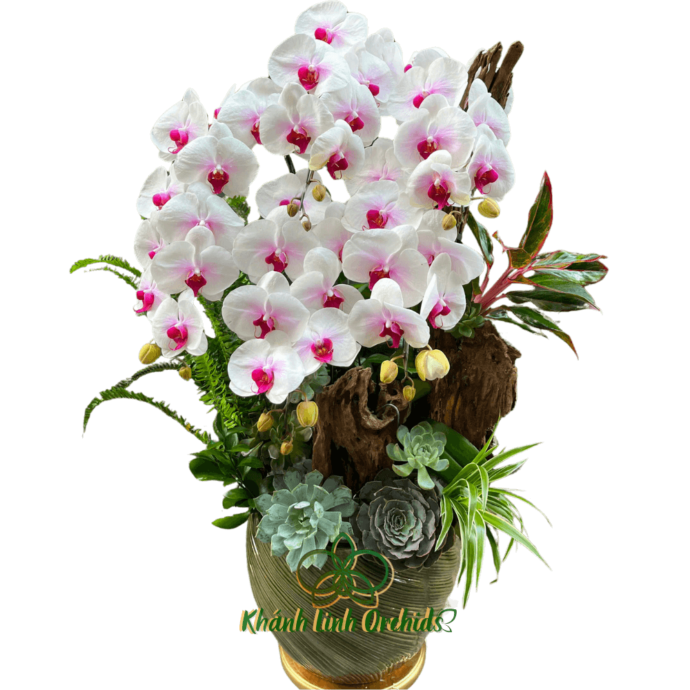 Chậu lan hồ điệp trắng điểm đỏ, trang trí cùng sen đá và gỗ, không chỉ là một món quà ý nghĩa mà còn là điểm nhấn hoàn hảo cho bất kỳ không gian nào. Một tác phẩm vừa sang trọng, vừa mang đậm giá trị phong thủy, hứa hẹn mang đến may mắn, tài lộc và sự thịnh vượng cho gia chủ.