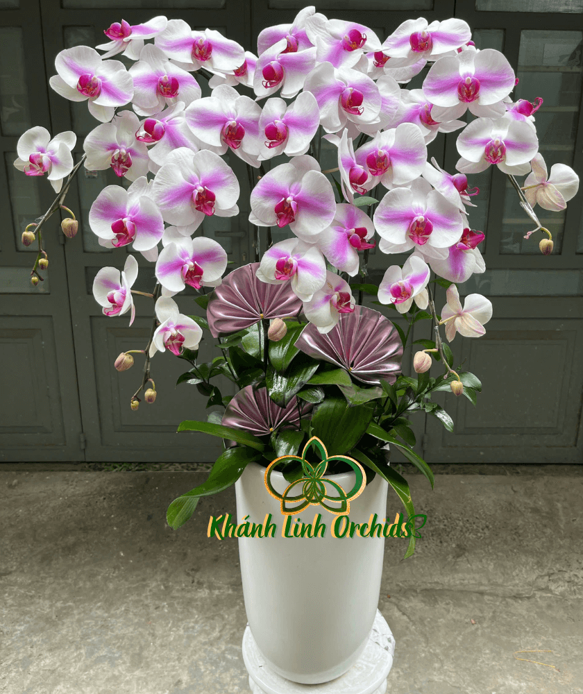 Được cắm trong chiếc chậu cao màu trắng tinh khiết, chậu hoa không chỉ toát lên vẻ đẹp thanh lịch mà còn mang lại sự sang trọng, quý phái cho không gian. Với chiều cao tổng thể khoảng 1m, chậu hoa tạo nên một điểm nhấn ấn tượng, nổi bật giữa căn phòng. Bên cạnh đó, những chiếc quạt màu tím nhạt được trang trí dưới cành hoa lan , nhẹ nhàng hòa quyện cùng sắc hoa, làm tăng thêm sự mềm mại và thanh thoát cho chậu hoa. Tất cả tạo nên một vẻ đẹp hài hòa, thu hút mọi ánh nhìn và mang đến một không gian đầy sự tươi mới và tinh tế.