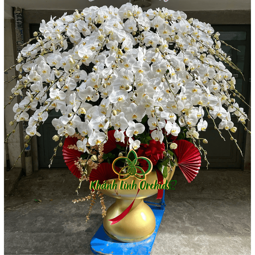 Chậu được đặt trong chiếc chậu ly phun màu vàng đồng cao cấp, có độ bóng nhẹ nhàng, mang đến vẻ đẹp sang trọng và quý phái. Đặc biệt, sự kết hợp trang trí với tone màu đỏ của nơ và quạt quanh gốc chậu làm tăng thêm phần nổi bật và ấn tượng, tạo nên sự tương phản đầy tinh tế giữa sắc trắng thanh khiết của hoa và màu đỏ nồng nàn, quyến rũ. Quạt xung quanh gốc chậu không chỉ giúp nâng cao vẻ đẹp của hoa mà còn tạo nên sự mềm mại, dễ chịu cho mắt nhìn. Đây thực sự là một chậu hoa Lan Hồ Điệp không chỉ đẹp về hình thức mà còn chứa đựng sự sang trọng, tinh tế, làm điểm nhấn hoàn hảo cho bất kỳ không gian nào, từ phòng khách đến văn phòng hay sự kiện đặc biệt.