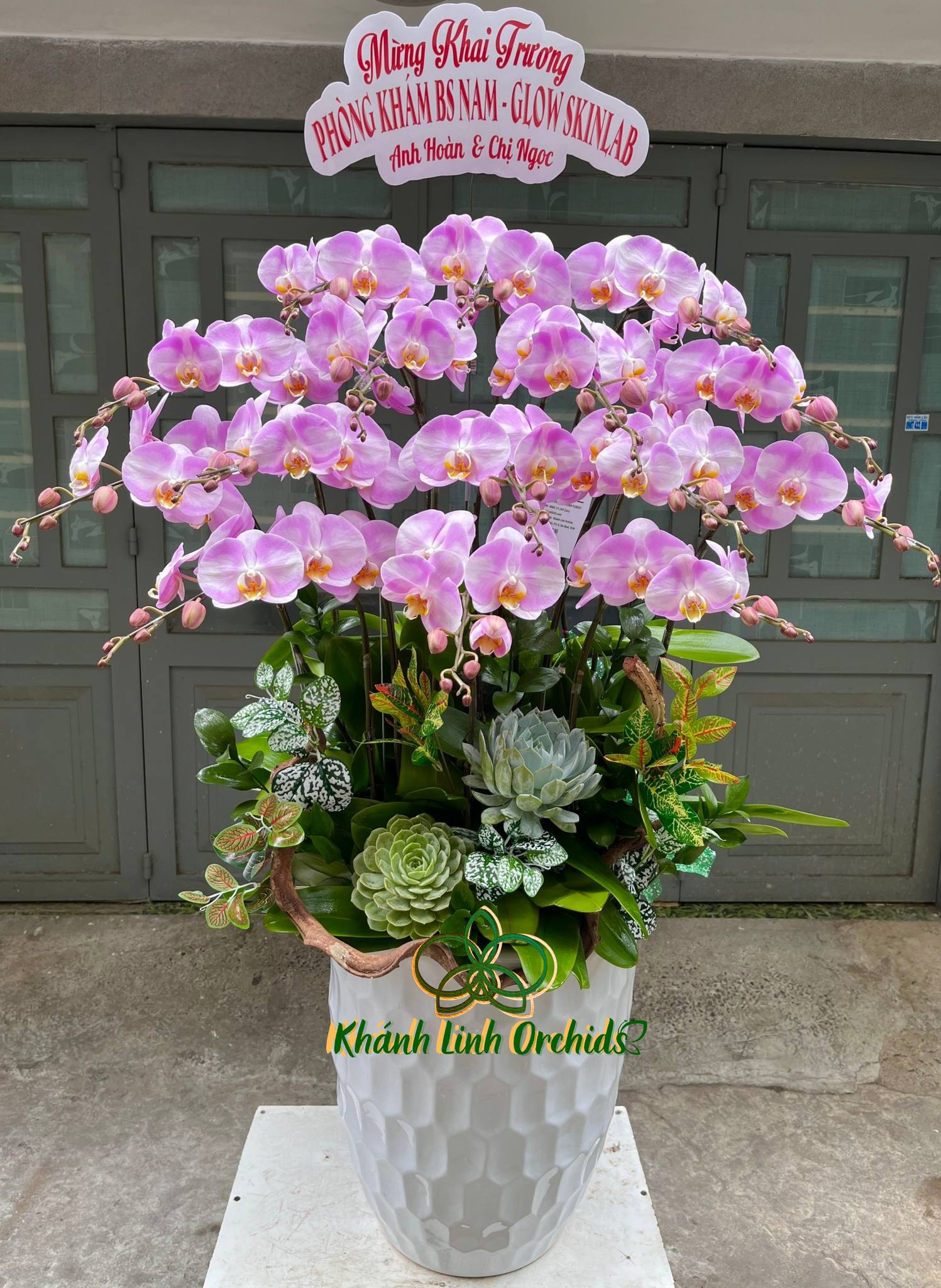 Bên cạnh đó, sự kết hợp với sen đá xanh mướt điểm xuyết quanh gốc hoa tạo thêm chiều sâu và sức sống cho chậu lan. Sen đá với vẻ đẹp mạnh mẽ, chắc chắn nhưng không kém phần tinh tế, làm tăng thêm sự hài hòa cho tổng thể. Màu xanh tươi mát của sen đá như thổi vào một làn gió mới, làm chậu hoa trở nên sinh động và cuốn hút hơn bao giờ hết.