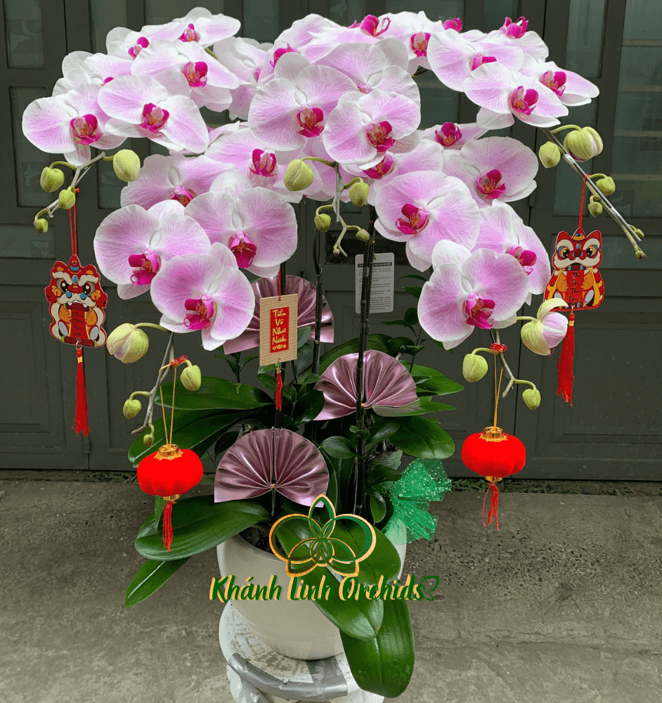 Được cắm trong chiếc chậu trắng trứng với bề mặt mịn màng, sang trọng, mỗi cành hoa lan đều được nâng niu. Chậu hoa trở thành một điểm nhấn nổi bật trong không gian, vừa nhẹ nhàng nhưng đầy sức hút. Trang trí thêm với chiếc quạt hồng duyên dáng, mềm mại, tạo cảm giác như những làn gió mùa xuân tươi mới, càng làm tăng phần sinh động cho chậu hoa. Liễng Tết trang trí xung quanh chậu mang đến không khí ấm cúng, vui vẻ, đậm chất lễ hội. Những chi tiết nhỏ này không chỉ làm tăng sự sang trọng mà còn mang lại cảm giác tươi mới, tạo ra không gian yên bình và thanh tịnh, là món quà lý tưởng cho dịp Tết hoặc để trang trí trong những không gian cần một điểm nhấn nhẹ nhàng nhưng đầy ý nghĩa.
