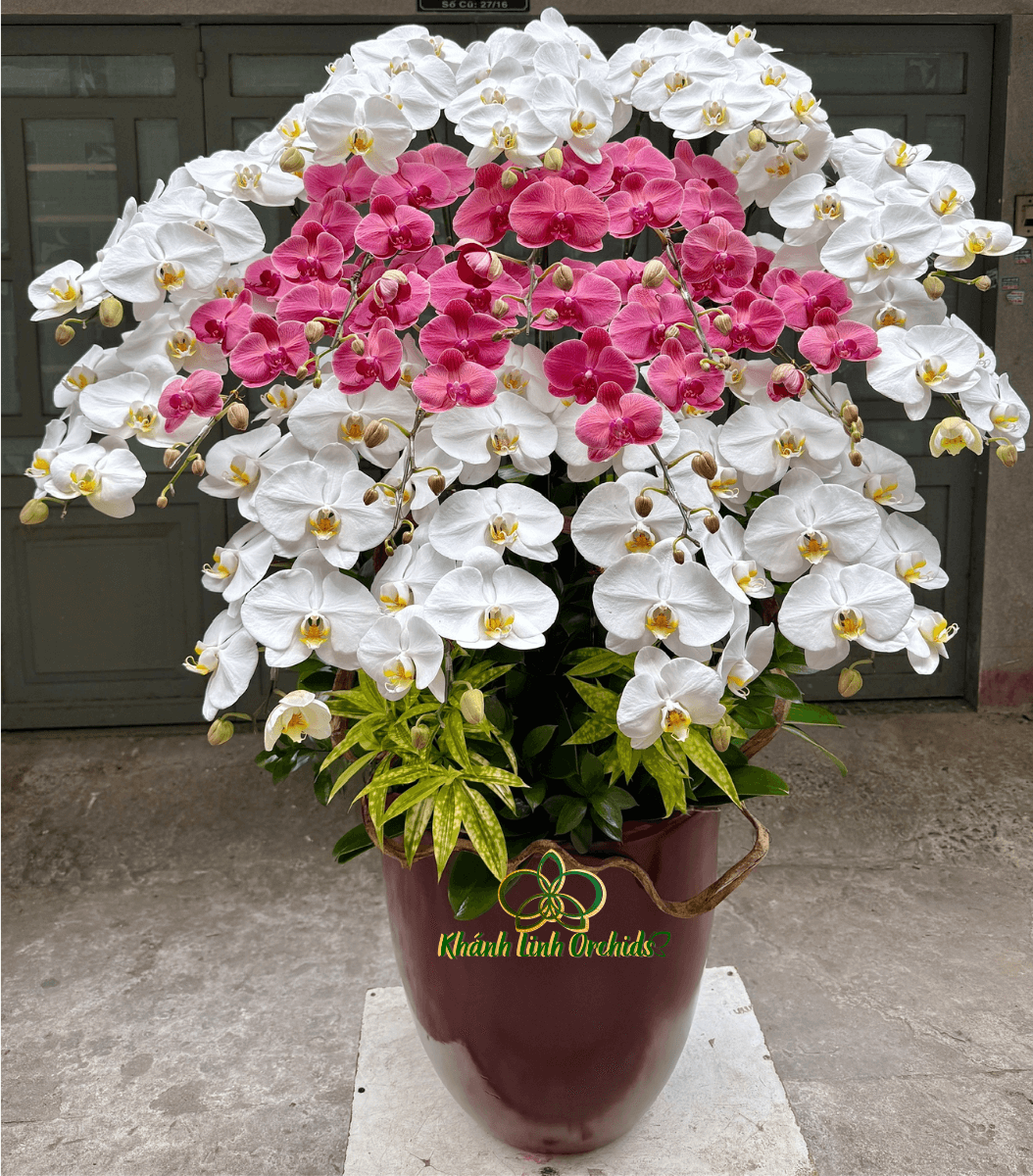Chậu sứ cao cấp được phun màu đỏ rượu – màu sắc tượng trưng cho sự quyền quý và đẳng cấp. Bề mặt láng bóng và họa tiết nhẹ nhàng làm nổi bật cụm hoa phía trên, góp phần nâng tầm tổng thể chậu lan thành một tác phẩm trang trí sang trọng và ý nghĩa. Chậu lan phù hợp để làm quà tặng nhân dịp khai trương, khánh thành, tân gia hoặc làm điểm nhấn cho sảnh tiếp khách, văn phòng giám đốc, nhà hàng – khách sạn cao cấp. Vừa mang tính thẩm mỹ, vừa thể hiện lời chúc cát tường đầy tinh tế.