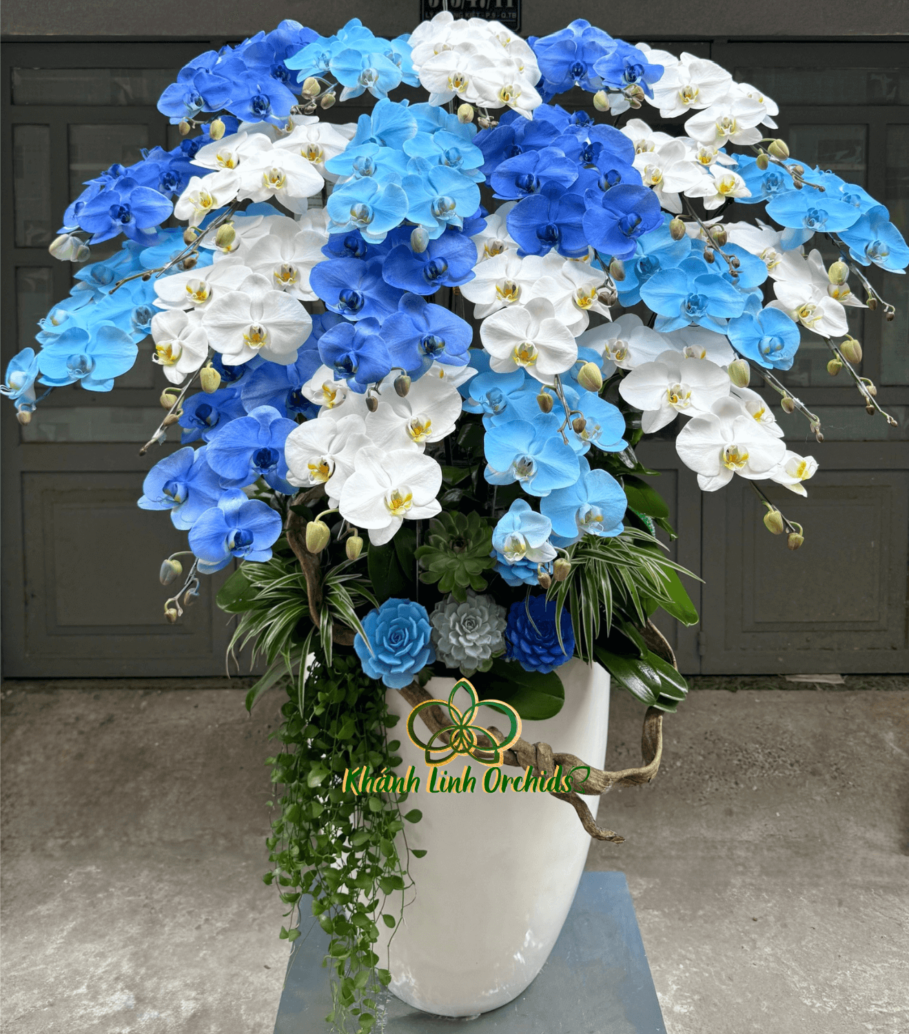 Phần trang trí được chăm chút tỉ mỉ với những cụm sen đá phun màu xanh ngọc và lam pastel, xen kẽ cùng dây rừng tự nhiên và lá rủ mềm mại, tạo điểm nhấn sinh động, giúp tổng thể chậu hoa trở nên hài hòa và có chiều sâu. Chậu sứ trắng cao cấp với dáng đứng sang trọng không chỉ tôn lên sắc hoa mà còn thể hiện sự tinh tế, đẳng cấp trong phong cách trang trí.