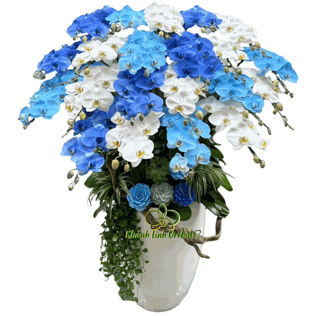 Lan hồ điệp Trắng phối phun màu Xanh 21 cành là lựa chọn hoàn hảo để làm quà tặng hoặc trang trí không gian hiện đại – từ văn phòng, khách sạn, nhà hàng đến phòng khách sang trọng. Mỗi cánh hoa như gửi gắm thông điệp về sự khởi đầu tốt lành, vững vàng và niềm tin vào tương lai tươi sáng. Đây chính là món quà mang ý nghĩa sâu sắc – biểu trưng cho sự thành công, thịnh vượng và tinh thần bền bỉ vượt qua mọi thử thách.