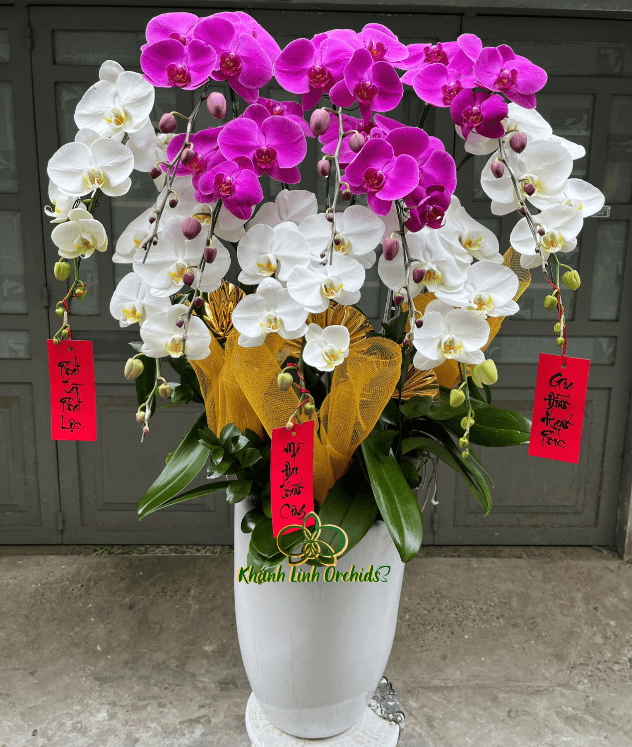 Những cành lan hồ điệp trắng mang vẻ đẹp thuần khiết, cánh hoa dày dặn, tròn đầy, sắc trắng nhẹ nhàng điểm nhụy vàng tạo cảm giác tinh tế và an yên. Xen kẽ là những cành lan hồ điệp tím rực rỡ, sắc tím sang trọng biểu trưng cho sự thủy chung, bền vững và thịnh vượng. Cách phối màu trắng – tím giúp chậu hoa có chiều sâu thị giác, vừa nổi bật vừa không quá phô trương, phù hợp với nhiều phong cách không gian khác nhau.