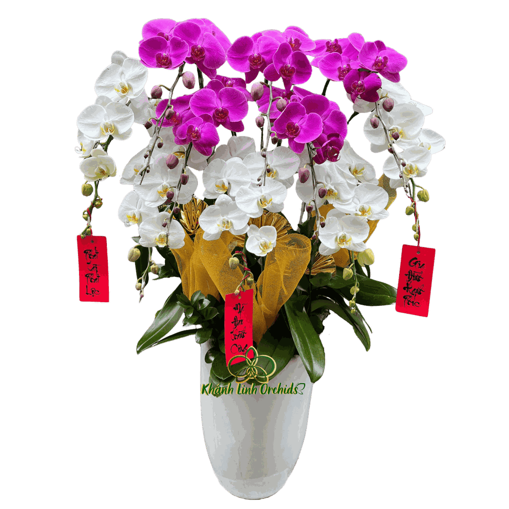 Chậu lan hồ điệp trắng phối tím 10 cành mang vẻ đẹp sang trọng, nổi bật và giàu ý nghĩa, rất phù hợp để trưng bày không gian ngày Tết, sảnh tiếp khách, văn phòng hoặc làm quà chúc mừng trang nhã. Sự kết hợp hài hòa giữa hai gam màu trắng tinh khôi và tím quyến rũ tạo nên tổng thể vừa thanh lịch, vừa cuốn hút ngay từ ánh nhìn đầu tiên.