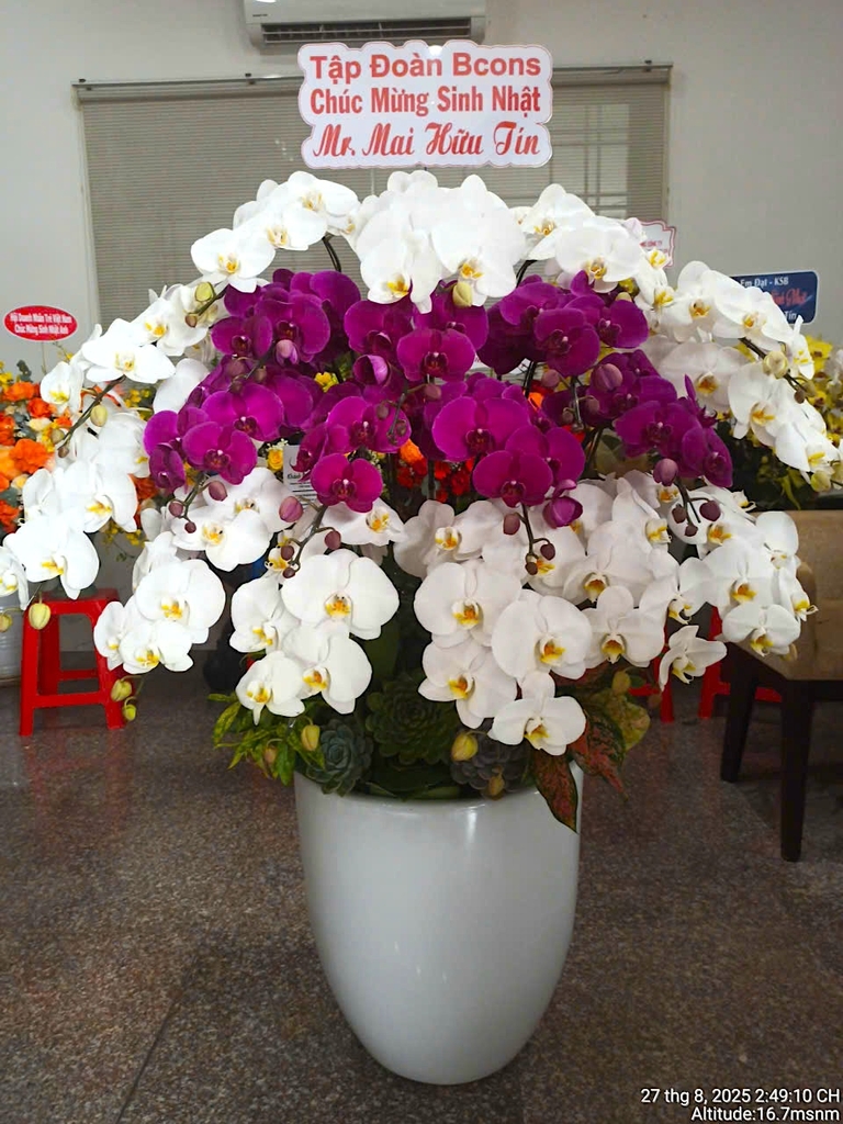 20 cành hoa được bố trí cân đối, tầng trên là sắc trắng tinh khôi gợi sự thanh lịch, tầng dưới là sắc tím đậm nổi bật, tạo hiệu ứng tương phản đầy ấn tượng. Sự phối hợp hài hòa này không chỉ mang tính thẩm mỹ cao mà còn gửi gắm ý nghĩa phong thủy may mắn: màu trắng biểu trưng cho sự khởi đầu mới, sự an yên, còn màu tím đậm tượng trưng cho sự thịnh vượng, quý phái và bền lâu.